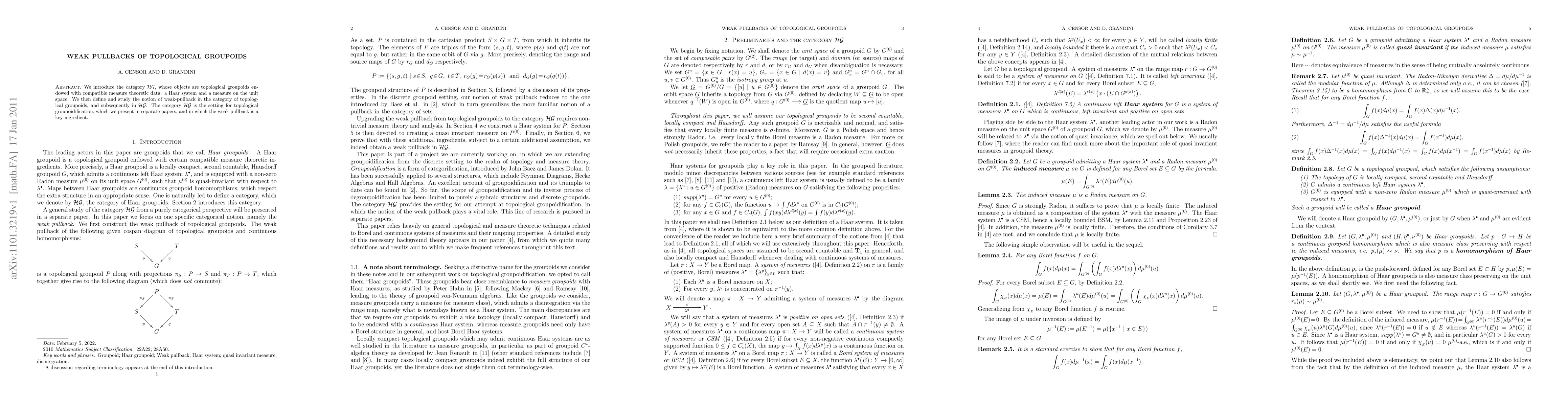 This paper introduces the category HG of topological groupoids with Haar systems and measures, defining and analyzing the concept of weak pullbacks within this framework. The weak pullback plays a crucial role in topological groupoidification, as detailed in subsequent studies.
