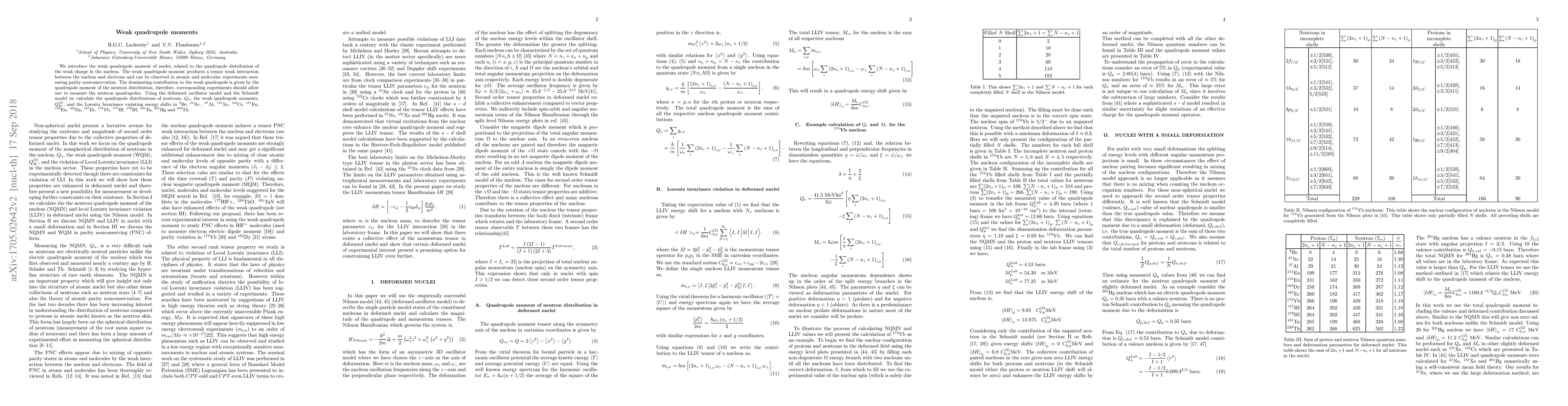 Collective effects in deformed atomic nuclei present possible avenues of study on the non-spherical distribution of neutrons and the violation of the local Lorentz invariance. We introduce the weak quadrupole moment of nuclei, related to the quadrupole distribution of the weak charge in the nucleus. The weak quadrupole moment produces tensor weak interaction between the nucleus and electrons and can be observed in atomic and molecular experiments measuring parity nonconservation. The dominating contribution to the weak quadrupole is given by the quadrupole moment of the neutron distribution, therefore, corresponding experiments should allow one to measure the neutron quadrupoles. Using the deformed oscillator model and the Schmidt model we calculate the quadrupole distributions of neutrons, $Q_{n}$, the weak quadrupole moments ,$Q_{W}^{(2)}$, and the Lorentz Innvariance violating energy shifts in $^{9}$Be, $^{21}$Ne , $^{27}$Al, $^{131}$Xe, $^{133}$Cs, $^{151}$Eu, $^{153}$Eu, $^{163}$Dy, $^{167}$Er, $^{173}$Yb, $^{177}$Hf, $^{179}$Hf, $^{181}$Ta, $^{201}$Hg and $^{229}$Th.
