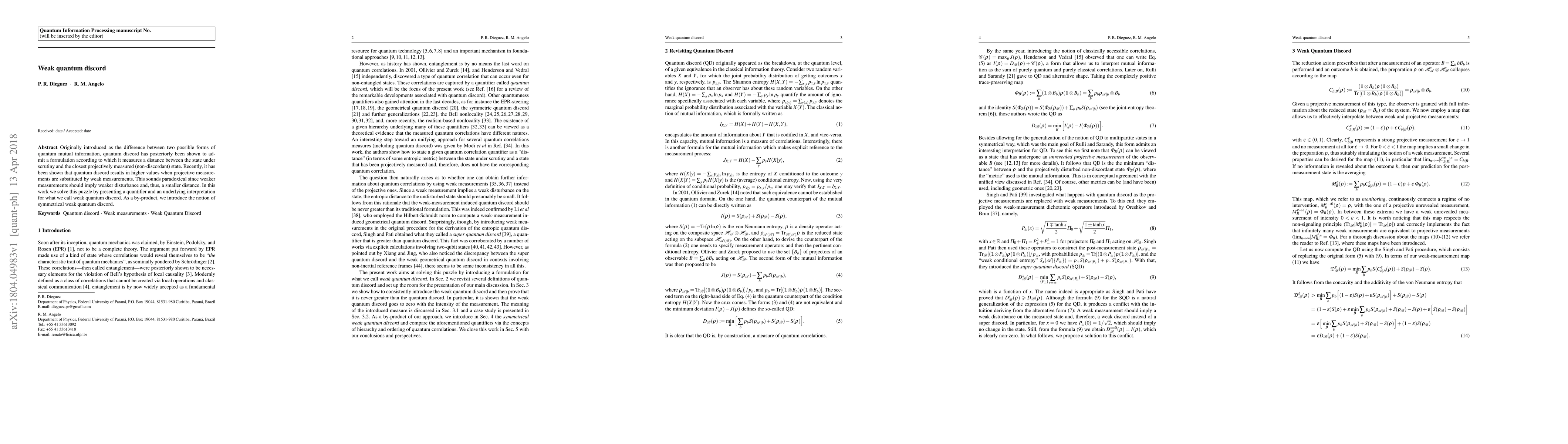 This paper introduces the concept of weak quantum discord, explaining how it measures the distance between a quantum state and its closest non-discordant state under weak measurements, resolving the paradox of higher discord values despite weaker disturbance. It also presents symmetrical weak quantum discord as a related notion.