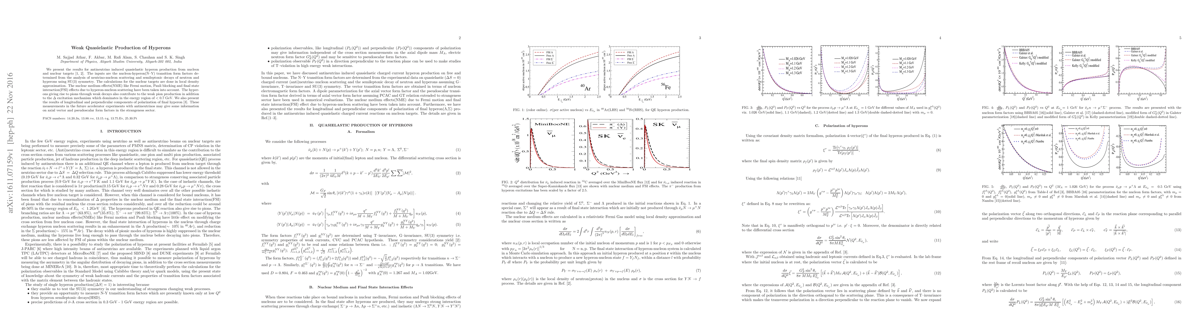 We present the results for antineutrino induced quasielastic hyperon production from nucleon and nuclear targets \cite{Alam:2014bya,Singh:2006xp}. The inputs are the nucleon-hyperon(N--Y) transition form factors determined from the analysis of neutrino-nucleon scattering and semileptonic decays of neutron and hyperons using SU(3) symmetry. The calculations for the nuclear targets are done in local density approximation. The nuclear medium effects(NME) like Fermi motion, Pauli blocking and final state interaction(FSI) effects due to hyperon-nucleon scattering have been taken into account. The hyperons giving rise to pions through weak decays also contribute to the weak pion production in addition to the $\Delta$ excitation mechanism which dominates in the energy region of $<$ 0.7 GeV. We also present the results of longitudinal and perpendicular components of polarization of final hyperon \cite{Akbar:2016awk}. These measurements in the future accelerator experiments with antineutrinos may give some information on axial vector and pseudoscalar form factors in the strangeness sector.