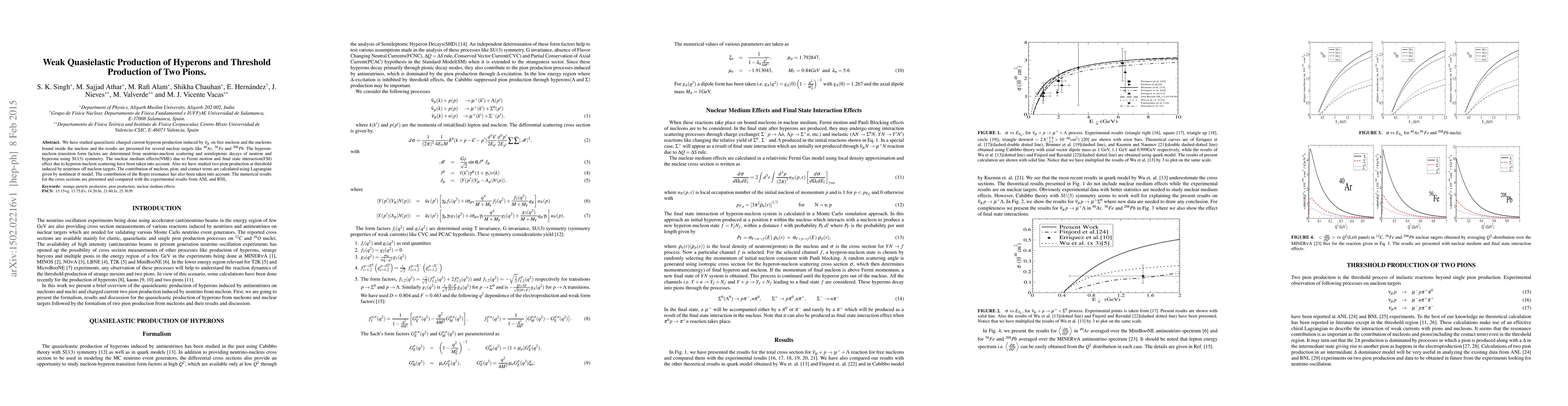 This paper investigates quasielastic hyperon production via $\bar\nu_\mu$ interactions with both free and bound nucleons, considering nuclear medium effects and final state interactions. It also examines two-pion production at threshold induced by neutrinos, analyzing contributions from nucleon, pion, and contact terms.