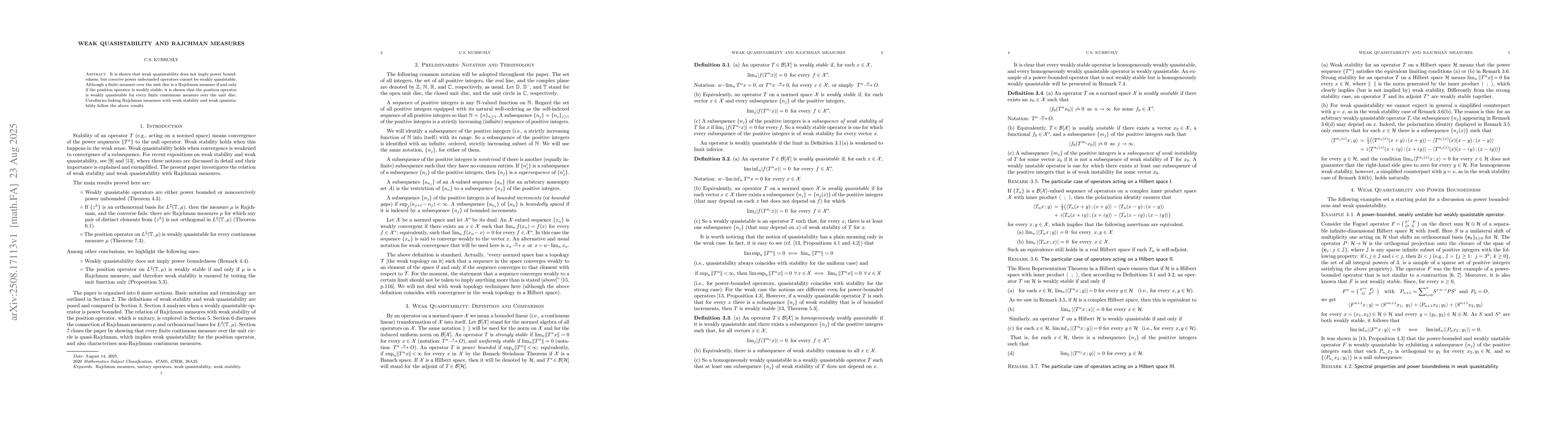 It is shown that weak quasistability does not imply power boundedness, but coercive power unbounded operators cannot be weakly quasistable.\ Although a finite measure over the unit disc is a Rajchman measure if and only if the position operator is weakly stable, it is shown that the position operator is weakly quasistable for every finite continuous measure over the unit disc.\ Corollaries linking Rajchman measures with weak stability and weak quasistability follow the above results.\