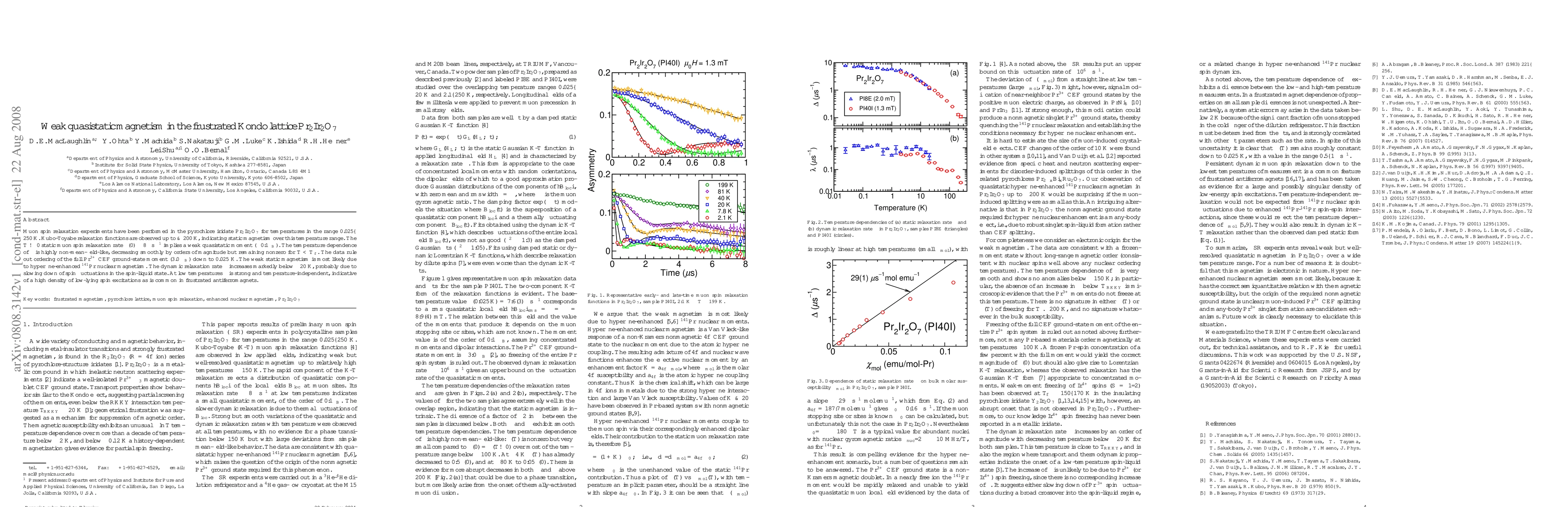 Muon spin relaxation experiments have been performed in the pyrochlore iridate Pr_2Ir_2O_7 for temperatures in the range 0.025-250 K. Kubo-Toyabe relaxation functions are observed up to > 200 K, indicating static magnetism over this temperature range. The T -> 0 static muon spin relaxation rate Delta(0) ~ 8 mus^-1 implies a weak quasistatic moment (~0.1 mu_B). The temperature dependence of Delta is highly non-mean-field-like, decreasing smoothly by orders of magnitude but remaining nonzero below ~150 K. The data rule out ordering of the full Pr^3+ CEF ground-state moment (3.0 mu_B) down to 0.025 K. The weak static magnetism is most likely due to hyperfine-enhanced ^141Pr nuclear magnetism. The dynamic relaxation rate lambda increases markedly below ~20 K, probably due to slowing down of spin fluctuations in the spin-liquid state. At low temperatures lambda is strong and temperature-independent, indicative of a high density of low-lying spin excitations as is common in frustrated antiferromagnets.