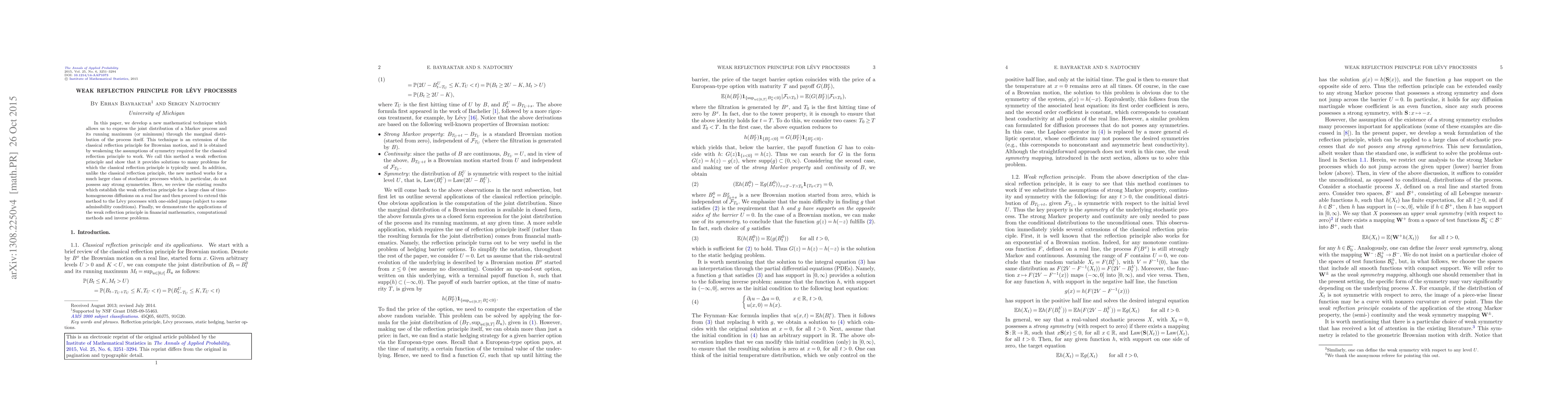 The paper develops a new mathematical technique called the weak reflection principle, which extends the classical reflection principle for Brownian motion by weakening symmetry assumptions. It is applied to a large class of time-homogeneous diffusions on the real line and extended to Lévy processes with one-sided jumps.