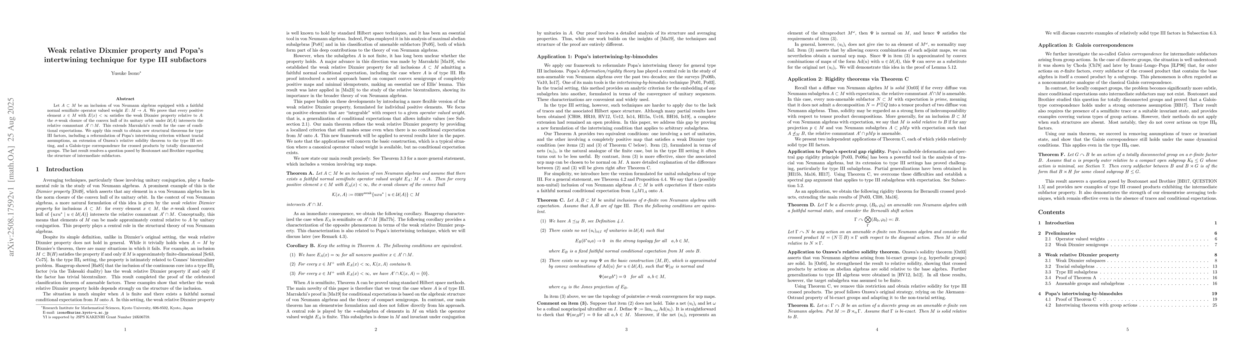 Let \( A \subset M \) be an inclusion of von Neumann algebras equipped with a faithful normal semifinite operator valued weight \( E \colon M \to A \). We prove that every positive element \( x \in M \) with \( E(x) < \infty \) satisfies the weak Dixmier property relative to \( A \): the \( \sigma \)-weak closure of the convex hull of its unitary orbit under \( \mathcal{U}(A) \) intersects the relative commutant \( A' \cap M \). This extends Marrakchi's result for the case of conditional expectations. We apply this result to obtain new structural theorems for type III factors, including a reformulation of Popa's intertwining criterion without tracial assumptions, an extension of Ozawa's relative solidity theorem to the type III setting, and a Galois-type correspondence for crossed products by totally disconnected groups. The last result resolves a question posed by Boutonnet and Brothier regarding the structure of intermediate subfactors.