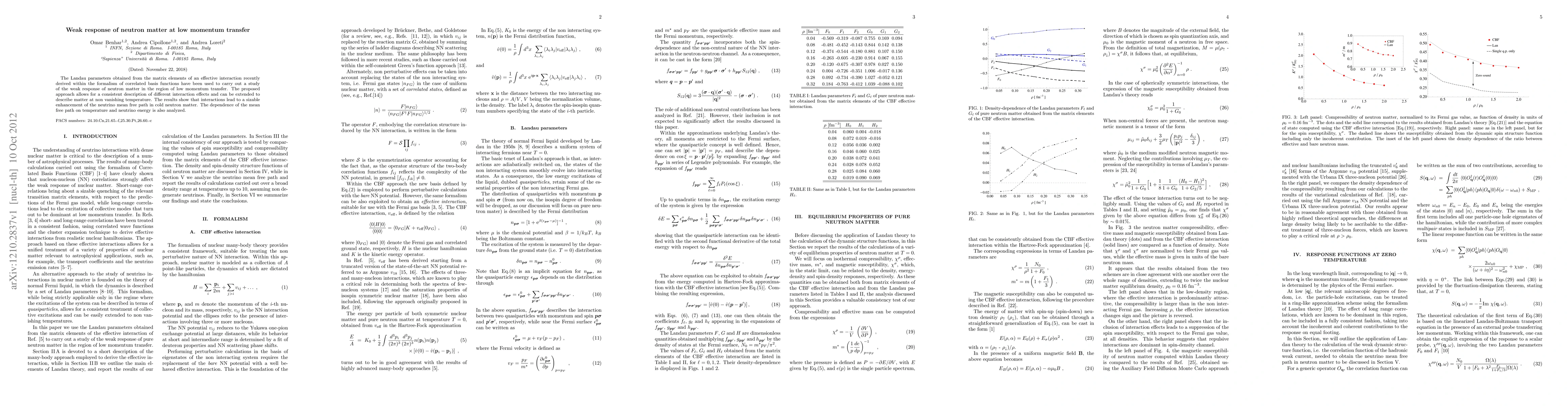 This study investigates the weak response of neutron matter at low momentum transfer using Landau parameters derived from an effective interaction within correlated basis functions. The results reveal significant enhancement of the neutrino mean free path in cold neutron matter, with further analysis on its dependence on temperature and neutrino energy.