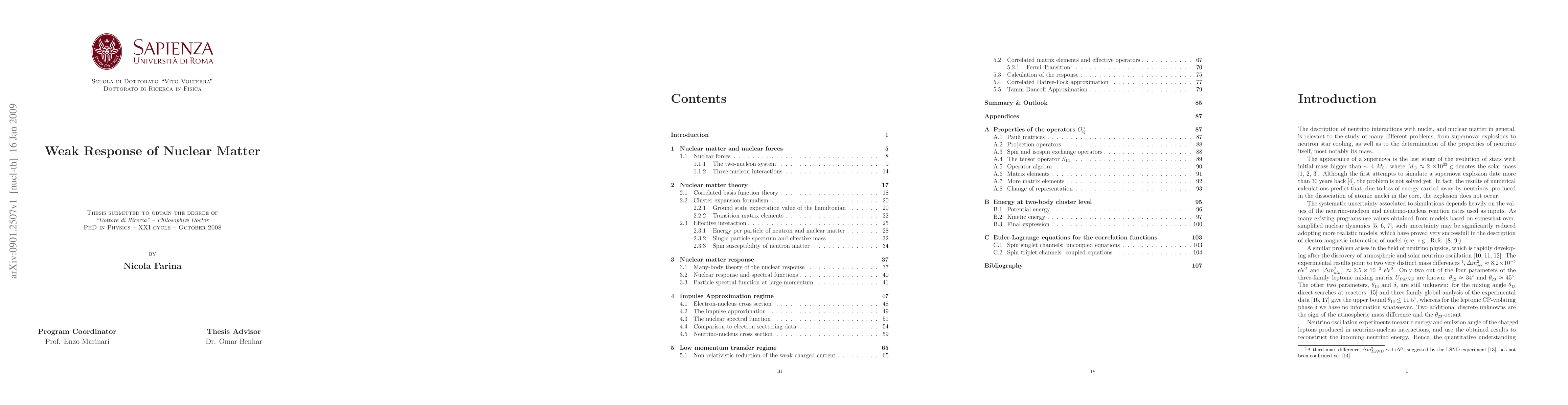 The quantitative understanding of neutrino interactions with nuclei and nuclear matter is needed to the study of many different problems. In the astrophysics environment, neutrino-nucleon and neutrino-nucleus reaction rates are used as inputs in the simulations of phenomena like supernov$\ae$ explosions and neutron star cooling. In the field of neutrino physics, the quantitative knowledge of neutrino-nucleus cross-section is critical to reduce the systematic uncertainty of the long baseline oscillation experiments. It is important to realize that, while neutrinos interacting in stellar matter typically have energies of the order of few MeV, the energies involved in long baseline oscillations experiments are much larger. For example, K2K experiment takes data in the region $E_{\nu} =0.5-3$ GeV. In this thesis, we describe how nuclear many-body theory provide a scheme allowing for a consistent treatment of neutrino-nucleus interactions at both high and low energies. We will show our predictions of the neutrino-nucleus cross section in the high energy regime and the results of our calculations for the nuclear matter weak response in the low energy regime.