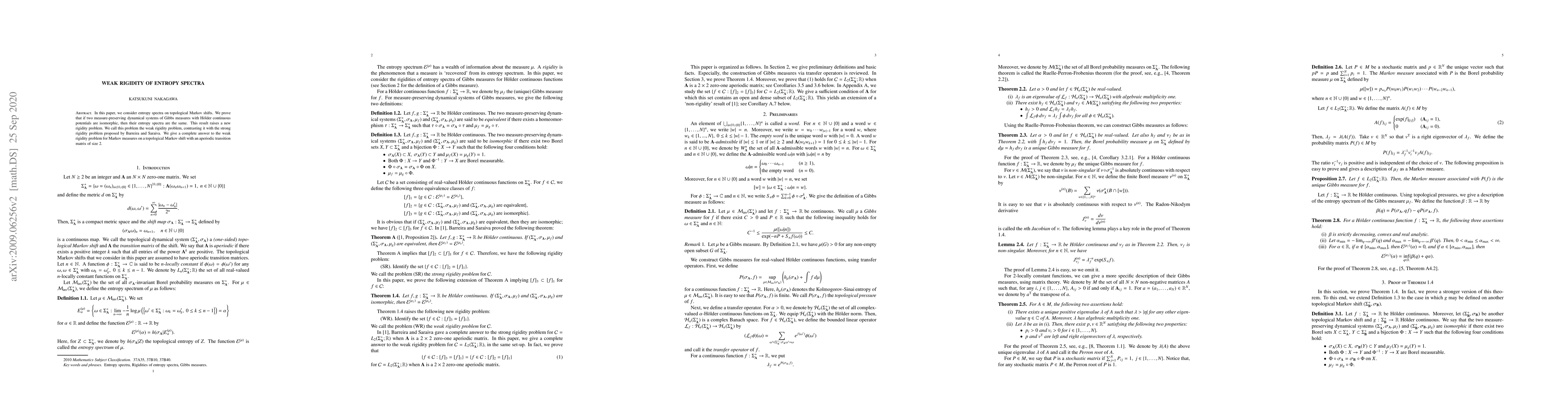 This paper proves that isomorphic measure-preserving dynamical systems with H\"older continuous potentials have identical entropy spectra, establishing a new weak rigidity problem. The authors provide a complete solution to this problem for Markov measures on a 2x2 aperiodic transition matrix.