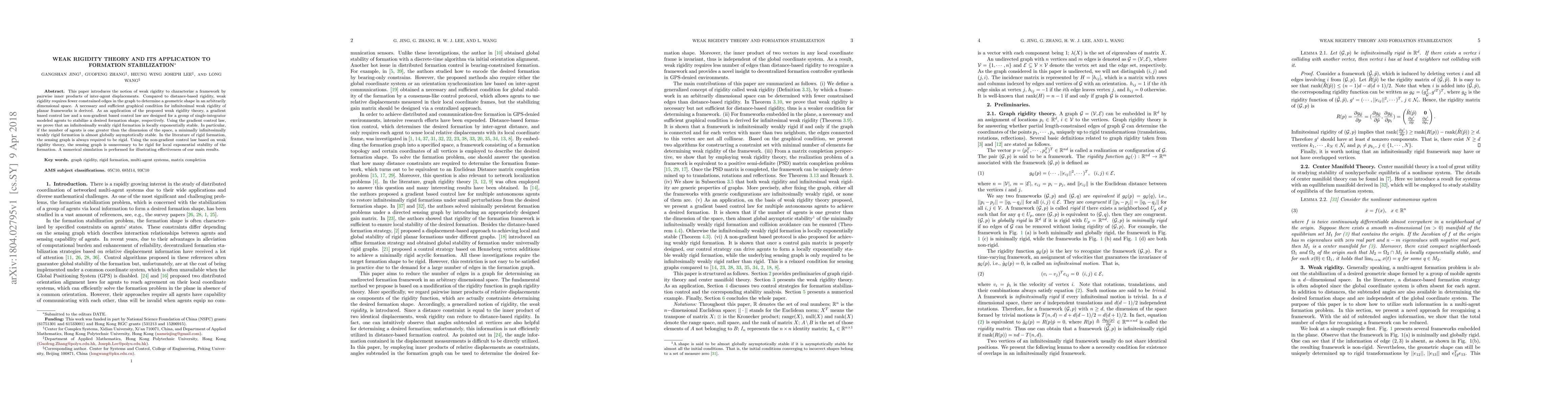This paper introduces the notion of weak rigidity to characterize a framework by pairwise inner products of inter-agent displacements. Compared to distance-based rigidity, weak rigidity requires fewer constrained edges in the graph to determine a geometric shape in an arbitrarily dimensional space. A necessary and sufficient graphical condition for infinitesimal weak rigidity of planar frameworks is derived. As an application of the proposed weak rigidity theory, a gradient based control law and a non-gradient based control law are designed for a group of single-integrator modeled agents to stabilize a desired formation shape, respectively. Using the gradient control law, we prove that an infinitesimally weakly rigid formation is locally exponentially stable. In particular, if the number of agents is one greater than the dimension of the space, a minimally infinitesimally weakly rigid formation is almost globally asymptotically stable. In the literature of rigid formation, the sensing graph is always required to be rigid. Using the non-gradient control law based on weak rigidity theory, the sensing graph is unnecessary to be rigid for local exponential stability of the formation. A numerical simulation is performed for illustrating effectiveness of our main results.
