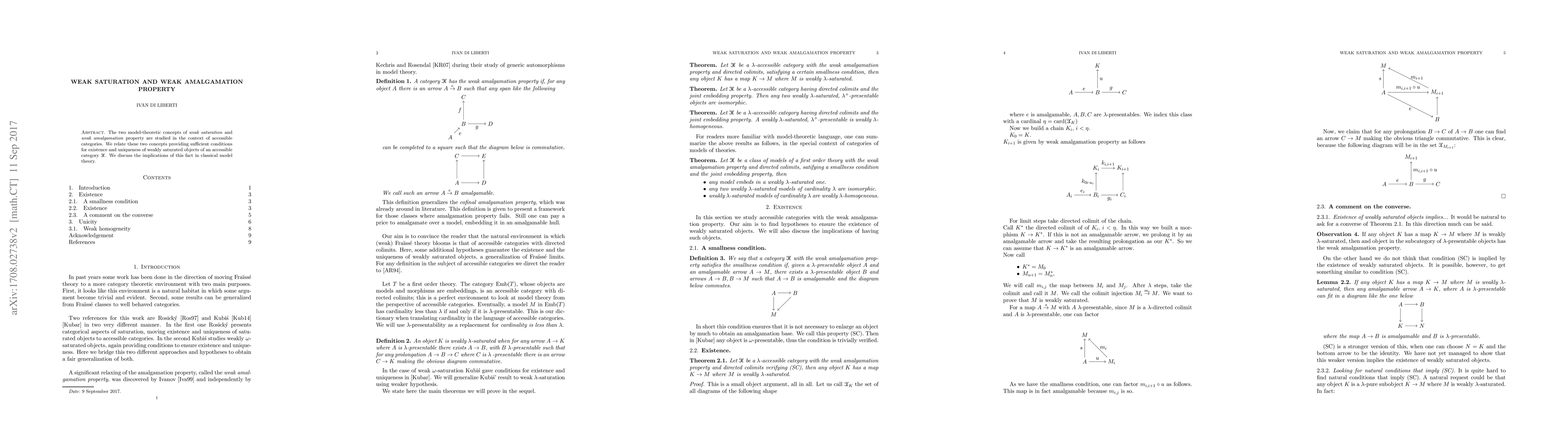 This paper explores the model-theoretic concepts of weak saturation and weak amalgamation within accessible categories, establishing conditions for the existence and uniqueness of weakly saturated objects. It discusses the implications for classical model theory.