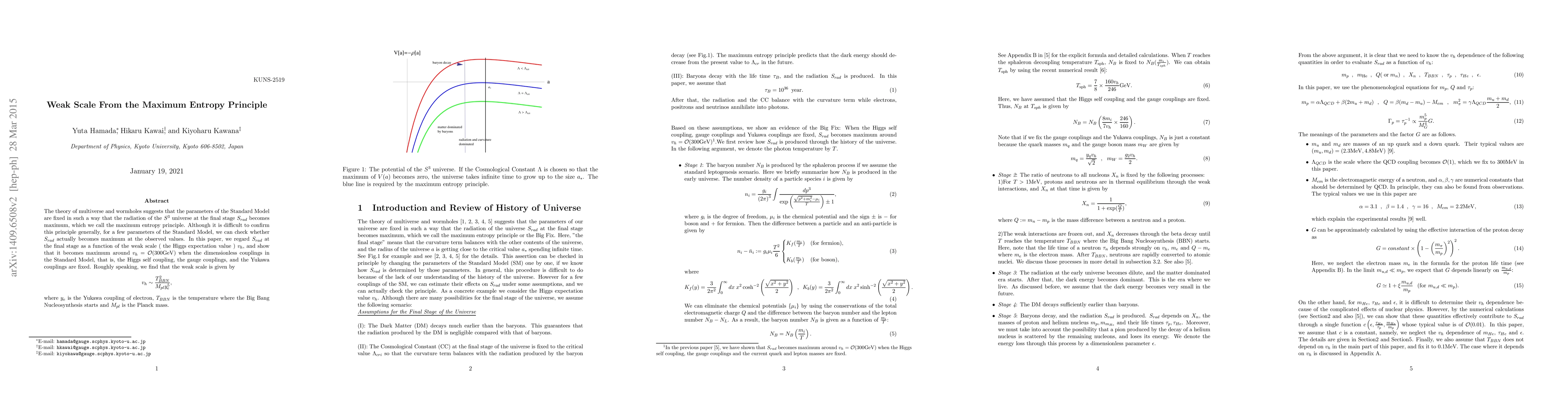 The theory of multiverse and wormholes suggests that the parameters of the Standard Model are fixed in such a way that the radiation of the $S^{3}$ universe at the final stage $S_{rad}$ becomes maximum, which we call the maximum entropy principle. Although it is difficult to confirm this principle generally, for a few parameters of the Standard Model, we can check whether $S_{rad}$ actually becomes maximum at the observed values. In this paper, we regard $S_{rad}$ at the final stage as a function of the weak scale ( the Higgs expectation value ) $v_{h}$, and show that it becomes maximum around $v_{h}={\cal{O}}(300\text{GeV})$ when the dimensionless couplings in the Standard Model, that is, the Higgs self coupling, the gauge couplings, and the Yukawa couplings are fixed. Roughly speaking, we find that the weak scale is given by \begin{equation} v_{h}\sim\frac{T_{BBN}^{2}}{M_{pl}y_{e}^{5}},\nonumber\end{equation} where $y_{e}$ is the Yukawa coupling of electron, $T_{BBN}$ is the temperature where the Big Bang Nucleosynthesis starts and $M_{pl}$ is the Planck mass.