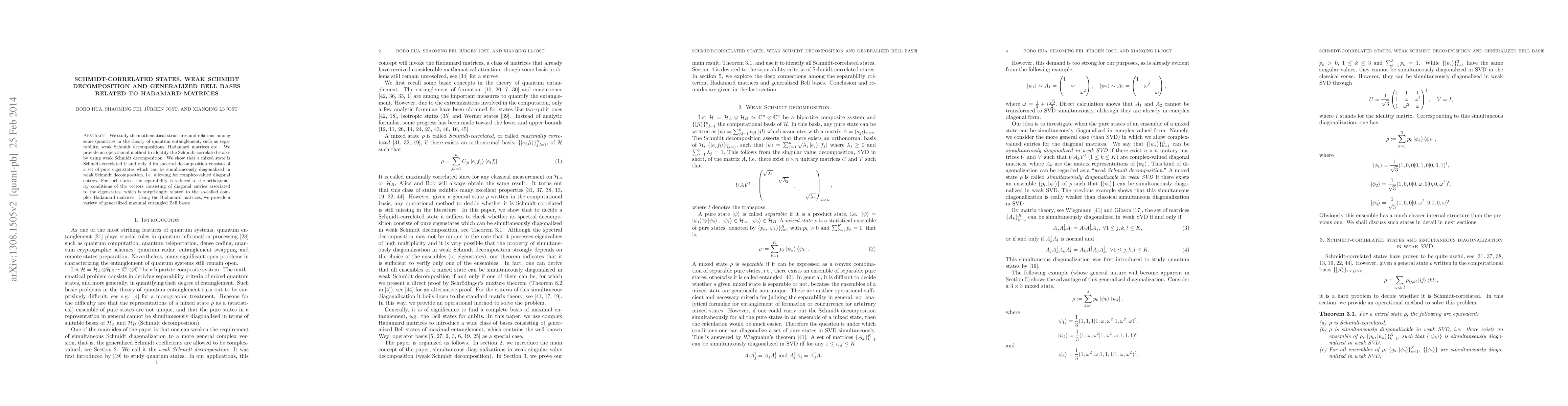 We study the mathematical structures and relations among some quantities in the theory of quantum entanglement, such as separability, weak Schmidt decompositions, Hadamard matrices etc.. We provide an operational method to identify the Schmidt-correlated states by using weak Schmidt decomposition. We show that a mixed state is Schmidt-correlated if and only if its spectral decomposition consists of a set of pure eigenstates which can be simultaneously diagonalized in weak Schmidt decomposition, i.e. allowing for complex-valued diagonal entries. For such states, the separability is reduced to the orthogonality conditions of the vectors consisting of diagonal entries associated to the eigenstates, which is surprisingly related to the so-called complex Hadamard matrices. Using the Hadamard matrices, we provide a variety of generalized maximal entangled Bell bases.