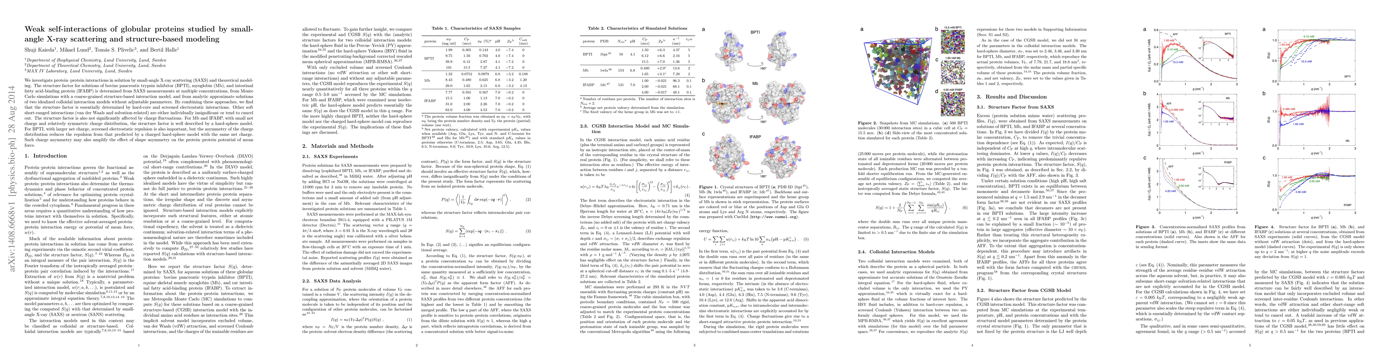 This study uses small-angle X-ray scattering and theoretical modeling to investigate weak self-interactions of globular proteins, finding that hard-core and screened electrostatic interactions dominate, while soft short-ranged interactions are negligible or cancel out. The structure factor for proteins like BPTI, myoglobin, and IFABP is well-described by hard-sphere models, except for BPTI where charge asymmetry reduces electrostatic repulsion.