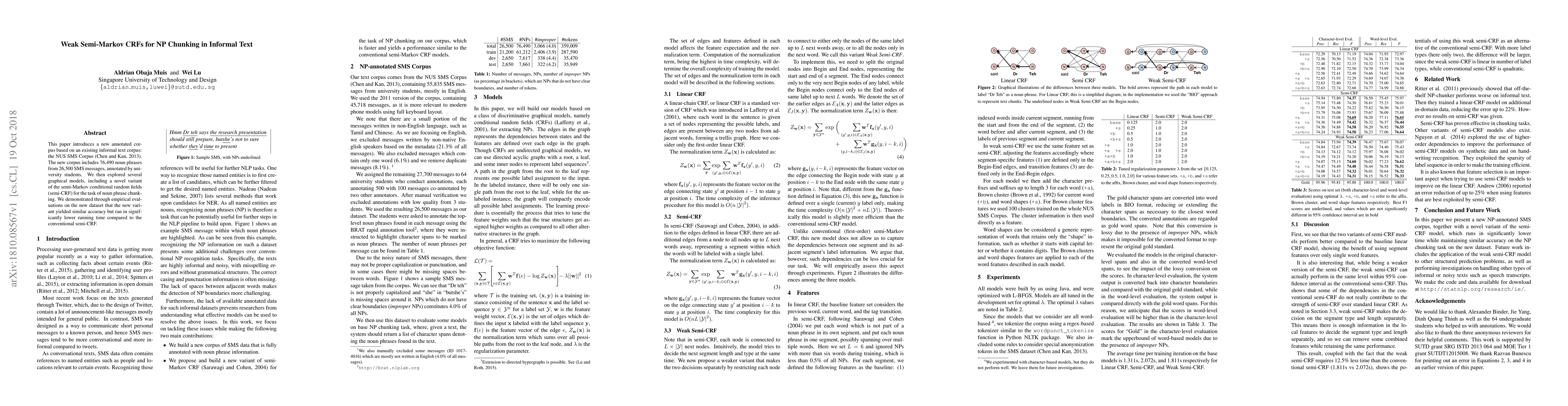 This paper introduces a new annotated corpus based on an existing informal text corpus: the NUS SMS Corpus (Chen and Kan, 2013). The new corpus includes 76,490 noun phrases from 26,500 SMS messages, annotated by university students. We then explored several graphical models, including a novel variant of the semi-Markov conditional random fields (semi-CRF) for the task of noun phrase chunking. We demonstrated through empirical evaluations on the new dataset that the new variant yielded similar accuracy but ran in significantly lower running time compared to the conventional semi-CRF.