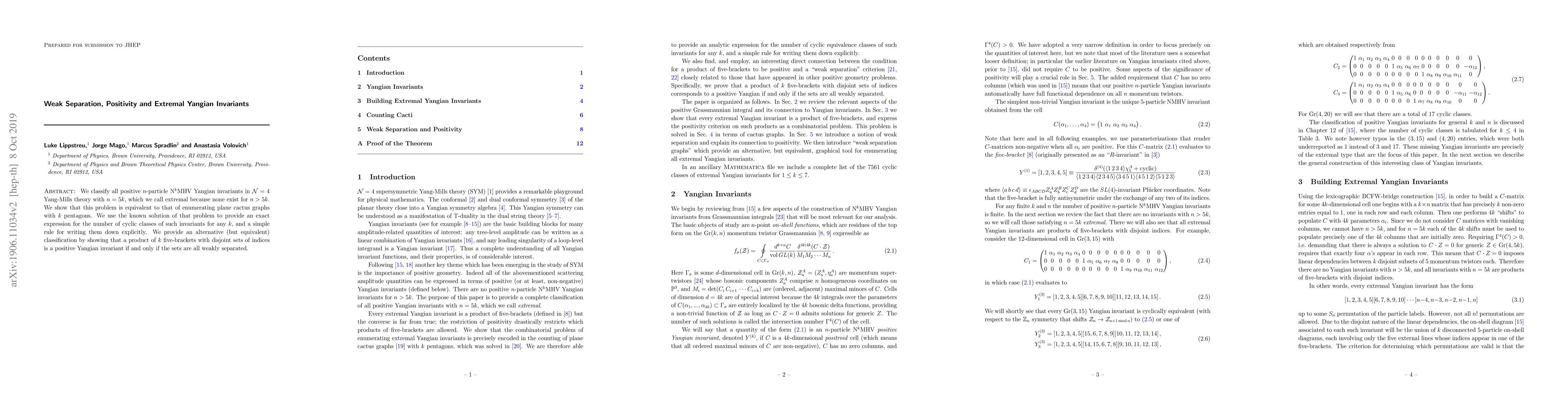 We classify all positive n-particle N^kMHV Yangian invariants in N=4 Yang-Mills theory with n=5k, which we call extremal because none exist for n>5k. We show that this problem is equivalent to that of enumerating plane cactus graphs with k pentagons. We use the known solution of that problem to provide an exact expression for the number of cyclic classes of such invariants for any k, and a simple rule for writing them down explicitly. As a byproduct, we provide an alternative (but equivalent) classification by showing that a product of k five-brackets with disjoint sets of indices is a positive Yangian invariant if and only if the sets are all weakly separated.