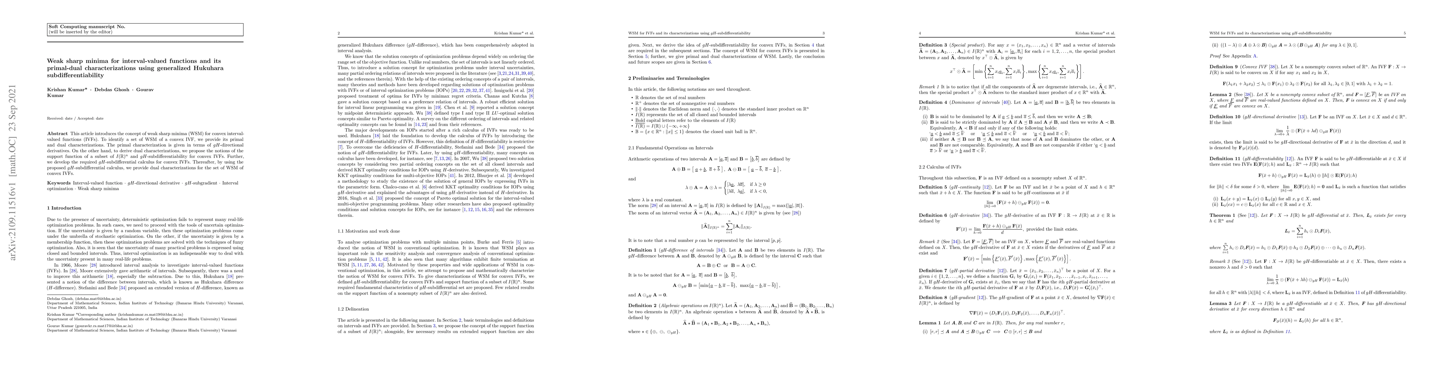This article introduces the concept of weak sharp minima (WSM) for convex interval-valued functions (IVFs). To identify a set of WSM of a convex IVF, we provide its primal and dual characterizations. The primal characterization is given in terms of $gH$-directional derivatives. On the other hand, to derive dual characterizations, we propose the notions of the support function of a subset of $I(\mathbb{R})^{n}$ and $gH$-subdifferentiability for convex IVFs. Further, we develop the required $gH$-subdifferential calculus for convex IVFs. Thereafter, by using the proposed $gH$-subdifferential calculus, we provide dual characterizations for the set of WSM of convex IVFs.