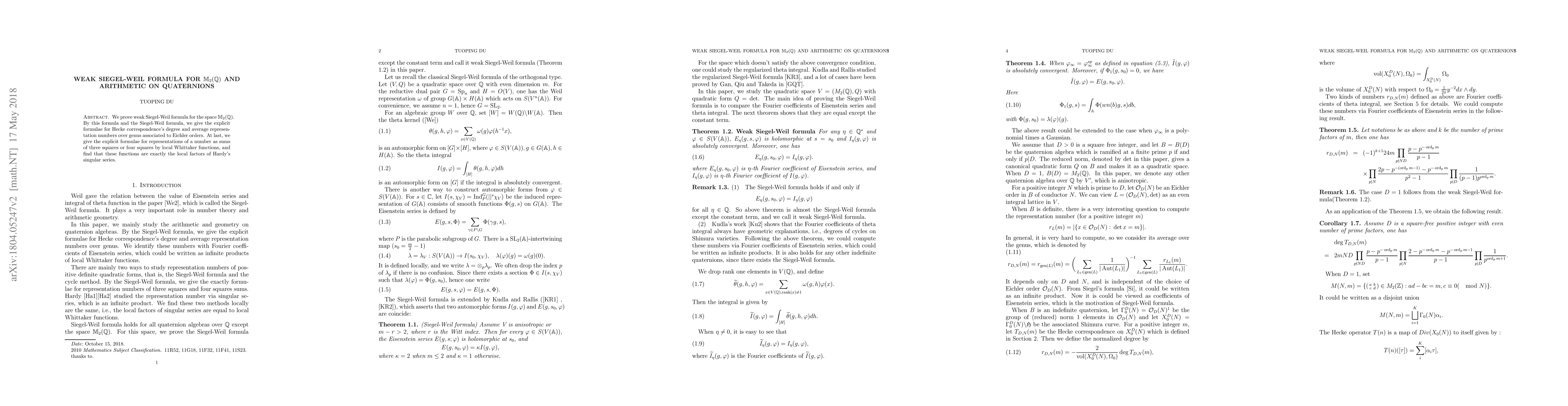 In this paper, we prove the weak Siegel-Weil formula for the space M_2(Q) . We study the Hecke correspondence and representation numbers associated to Eichler orders, and give the explicit formula for degree of Hecke correspondence and average representation numbers over genus. This formula could recover the main results in [DuYang]. We could identify these numbers with the Fourier coefficients of Eisenstein series via Siegel-Weil formula(weak Siegel-Weil formula for M_2(Q). In the last part of this article, we reprove four square sum Theorem via Siegel-Weil formula and Kudla's matching.