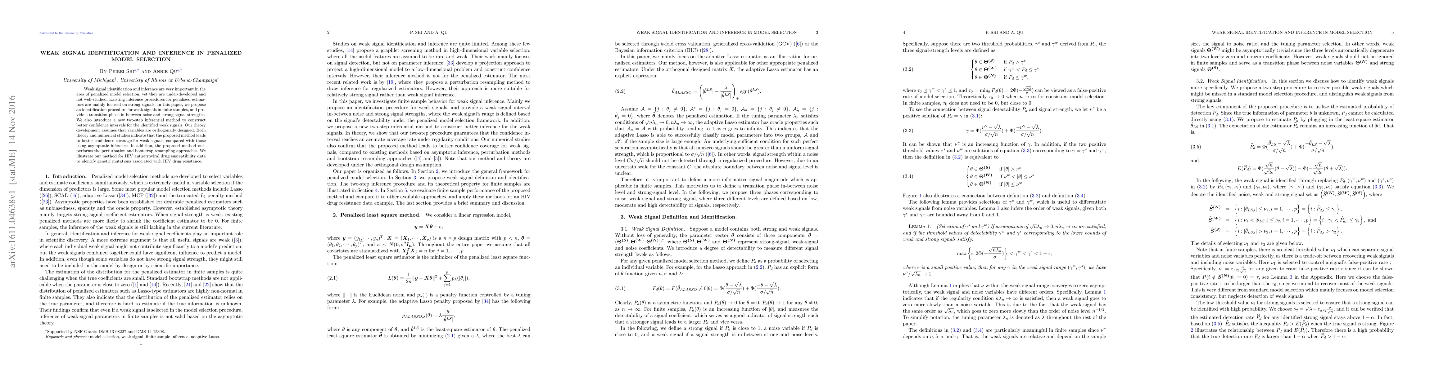 This paper proposes a new identification procedure for weak signals in penalized model selection, introducing a two-step inferential method for better confidence intervals. The method outperforms existing approaches, as demonstrated through theoretical analysis and numerical studies, and is illustrated with HIV drug resistance data.