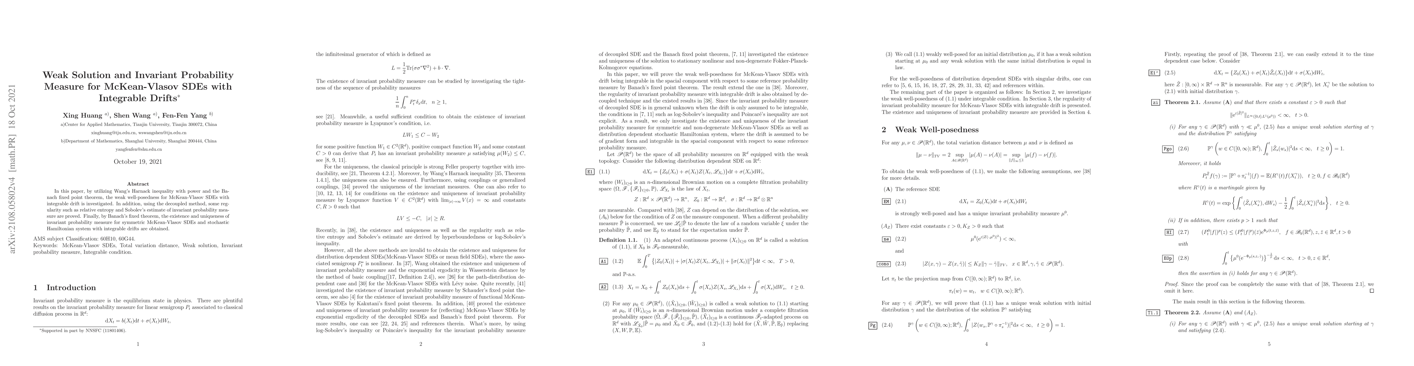 The paper investigates weak well-posedness for McKean-Vlasov SDEs with integrable drift using Wang's Harnack inequality with power and the Banach fixed point theorem. It also proves regularity of invariant probability measure using the decoupled method and Banach's fixed theorem.