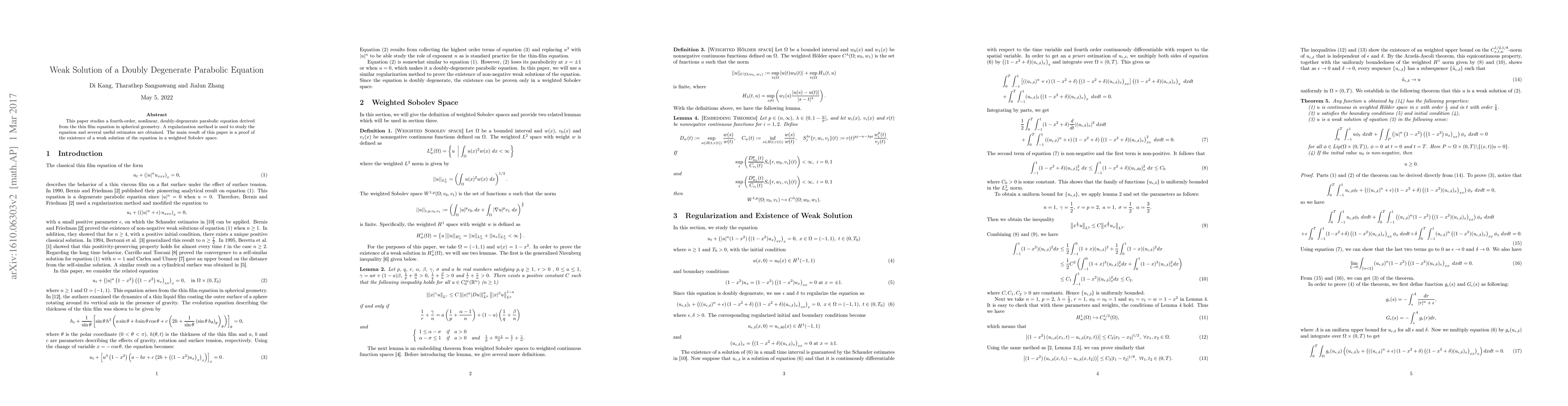 This paper investigates a fourth-order, nonlinear, doubly-degenerate parabolic equation originating from the thin film equation in spherical geometry. Utilizing a regularization method, the authors prove the existence of a weak solution in a weighted Sobolev space.