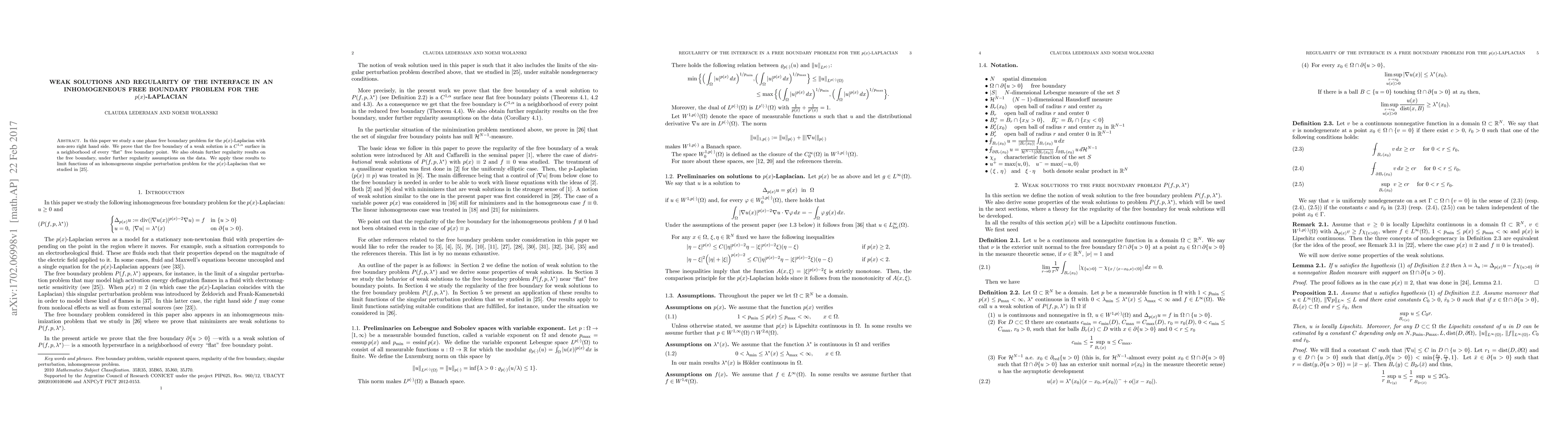 This paper investigates the regularity of the free boundary in an inhomogeneous free boundary problem for the p(x)-Laplacian, proving that it is a C^1 surface locally. Further regularity is obtained under additional data assumptions, and results are applied to limit functions of a related singular perturbation problem.