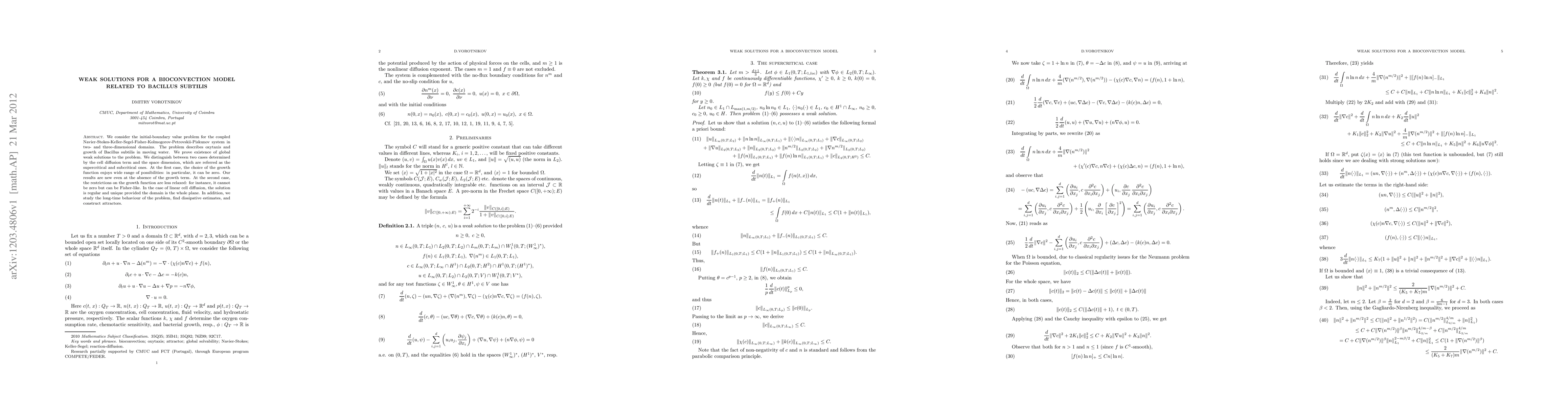This research proves global weak solutions for a mathematical model describing Bacillus subtilis movement in water, categorizing cases based on cell diffusion and dimension. It also examines long-term behavior, providing dissipative estimates and constructing attractors, with specific conditions for regular and unique solutions in certain scenarios.