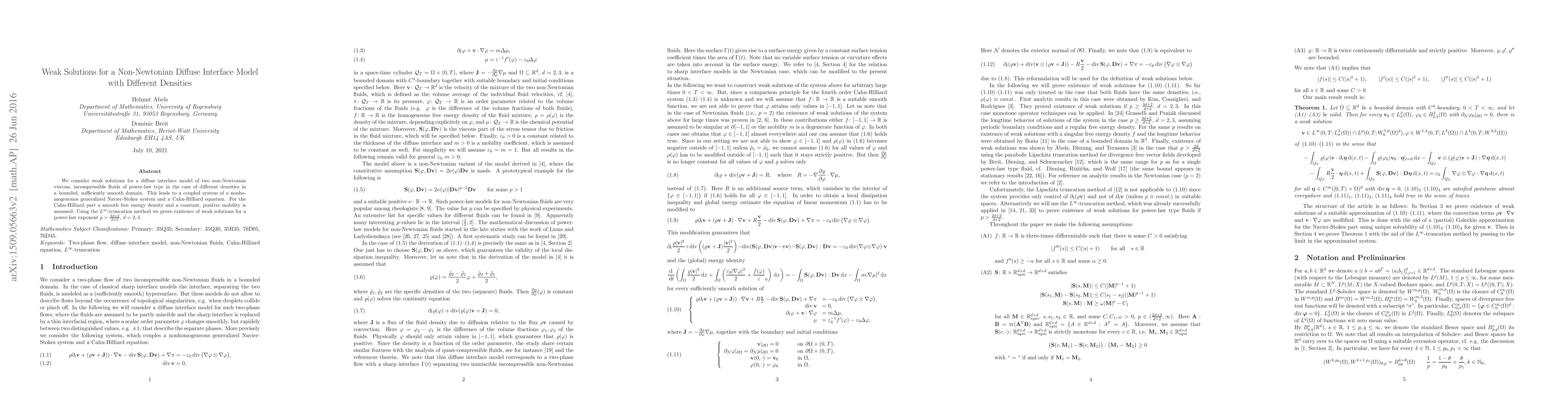 This paper explores weak solutions for a diffuse interface model of two non-Newtonian fluids with differing densities, leading to a coupled system of a nonhomogeneous generalized Navier-Stokes and a Cahn-Hilliard equation. Existence of weak solutions is proven using the $L^\infty$-truncation method for power-law exponents $p>\frac{2d+2}{d+2}$, where $d=2,3$.