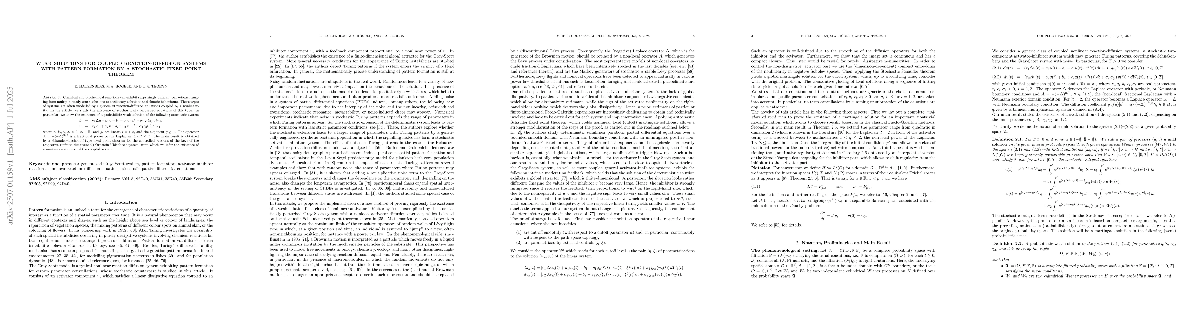 Chemical and biochemical reactions can exhibit surprisingly different behaviours, ranging from multiple steady-state solutions to oscillatory solutions and chaotic behaviours. These types of systems are often modelled by a system of reaction-diffusion equations coupled by a nonlinearity. In the article, we study the existence of stochastically perturbed equations of this type. In particular, we show the existence of a probabilitic weak solution of the following stochastic system \begin{align*} \dot {u} & = r_1\,\Delta u+ a_1\, u + b_1 -c_1\, u\cdot v^q+\sigma_1\, g_1(u)\circ \dot W_1, \\ \dot{v} & = r_2 \,A v + a_2\, v + b_2 +c_2\, u\cdot v^q + \sigma_2\, g_2(v)\circ \dot W_2, \end{align*} where $r_i,b_i,c_i, \sigma_i>0$, $a_i\in\mathbb{R}$, and $g_i$ are linear, $i=1,2$, and the exponent $q\geq 1$. The operator $A=-(-\Delta)^{\aleph/2}$ is a fractional power of the Laplacian, $1<\aleph \le2$. The main result is obtained by a Schauder-Tychonoff type fixed point theorem for the controlled versions of the laws of the respective (infinite dimensional) Ornstein-Uhlenbeck system, from which we infer the existence of a weak solution of the coupled system.