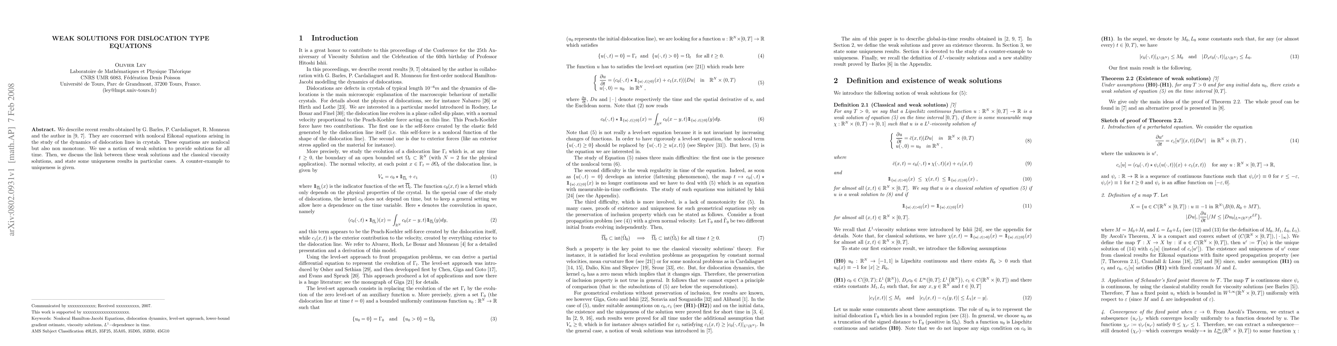 We describe recent results obtained by G. Barles, P. Cardaliaguet, R. Monneau and the author recently. They are concerned with nonlocal Eikonal equations arising in the study of the dynamics of dislocation lines in crystals. These equations are nonlocal but also non monotone. We use a notion of weak solution to provide solutions for all time. Then, we discuss the link between these weak solutions and the classical viscosity solutions, and state some uniqueness results in particular cases. A counter-example to uniqueness is given.