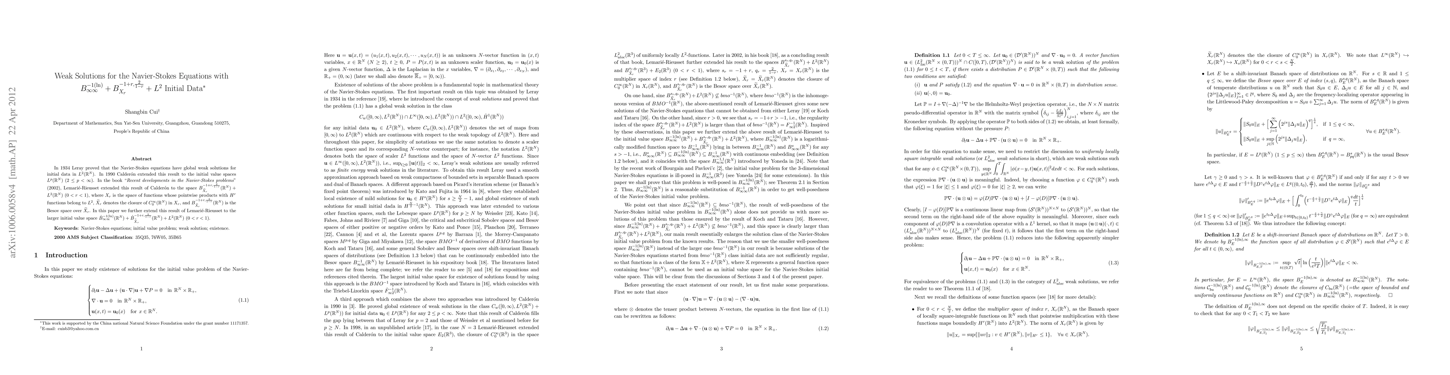 This paper extends previous results on weak solutions to the Navier-Stokes equations by considering initial data in the larger space ${B}^{-1(ln)}_{\infty\infty}+{B}_{\widetilde{\dot{X}}_r}^{-1+r,\frac{2}{1-r}}+L^2$, improving upon the work of Lemarié-Rieusset.