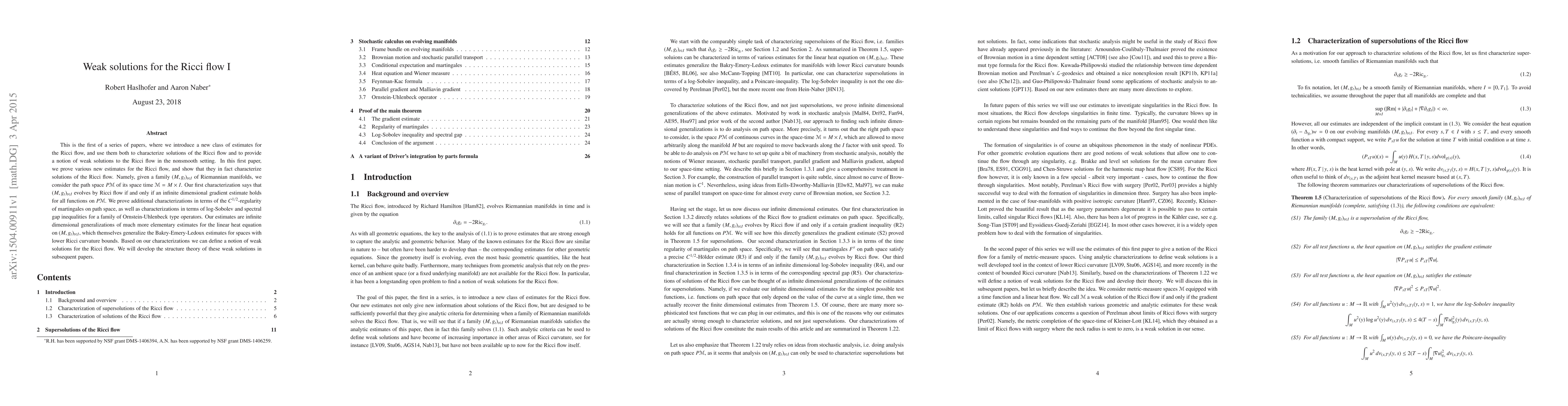 This is the first of a series of papers, where we introduce a new class of estimates for the Ricci flow, and use them both to characterize solutions of the Ricci flow and to provide a notion of weak solutions to the Ricci flow in the nonsmooth setting. In this first paper, we prove various new estimates for the Ricci flow, and show that they in fact characterize solutions of the Ricci flow. Namely, given a family $(M,g_t)_{t\in I}$ of Riemannian manifolds, we consider the path space $P\mathcal{M}$ of its space time $\mathcal{M}=M\times I$. Our first characterization says that $(M,g_t)_{t\in I}$ evolves by Ricci flow if and only if an infinite dimensional gradient estimate holds for all functions on $P\mathcal{M}$. We prove additional characterizations in terms of the $C^{1/2}$-regularity of martingales on path space, as well as characterizations in terms of log-Sobolev and spectral gap inequalities for a family of Ornstein-Uhlenbeck type operators. Our estimates are infinite dimensional generalizations of much more elementary estimates for the linear heat equation on $(M,g_t)_{t\in I}$, which themselves generalize the Bakry-Emery-Ledoux estimates for spaces with lower Ricci curvature bounds. Based on our characterizations we can define a notion of weak solutions for the Ricci flow. We will develop the structure theory of these weak solutions in subsequent papers.