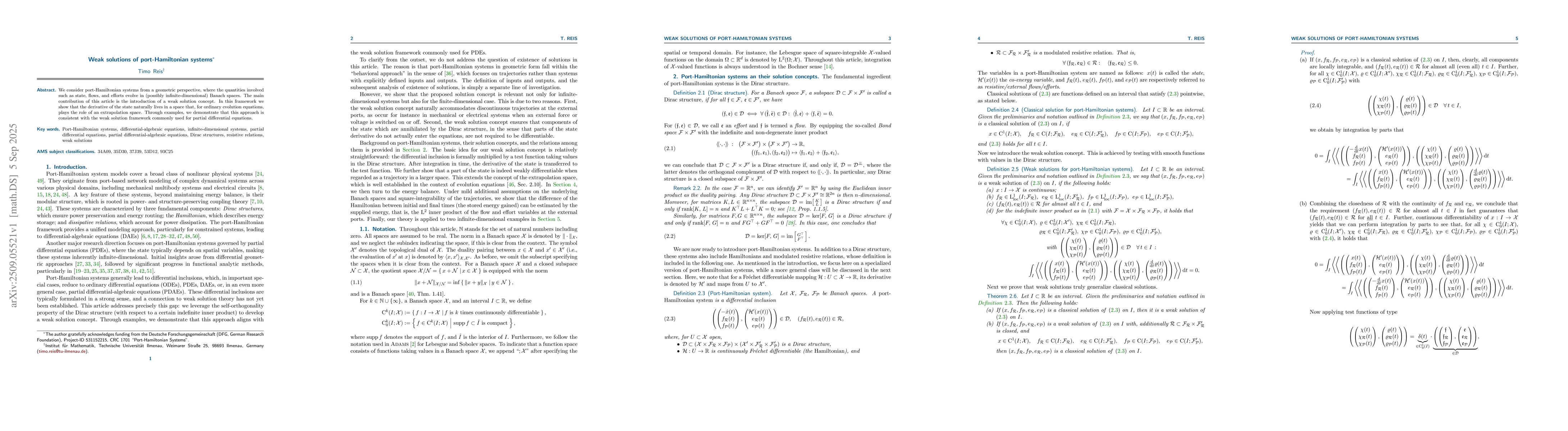 We consider port-Hamiltonian systems from a geometric perspective, where the quantities involved such as state, flows, and efforts evolve in (possibly infinite-dimensional) Banach spaces. The main contribution of this article is the introduction of a weak solution concept. In this framework we show that the derivative of the state naturally lives in a space that, for ordinary evolution equations, plays the role of an extrapolation space. Through examples, we demonstrate that this approach is consistent with the weak solution framework commonly used for partial differential equations.