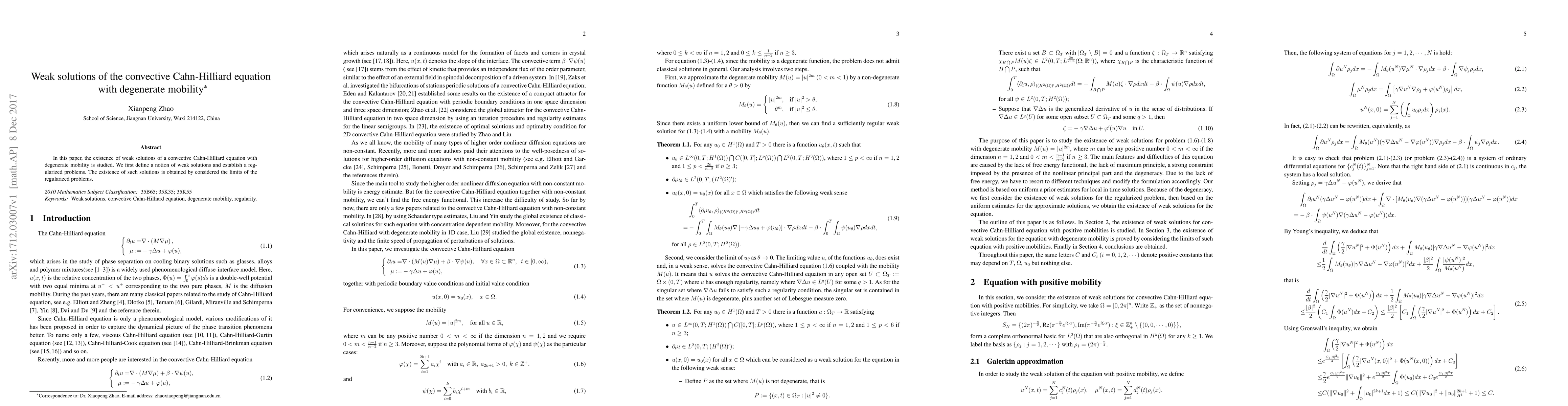 This paper investigates the existence of weak solutions for a convective Cahn-Hilliard equation with degenerate mobility, defining a notion of weak solutions and establishing regularized problems, ultimately proving their existence through limits of these problems.