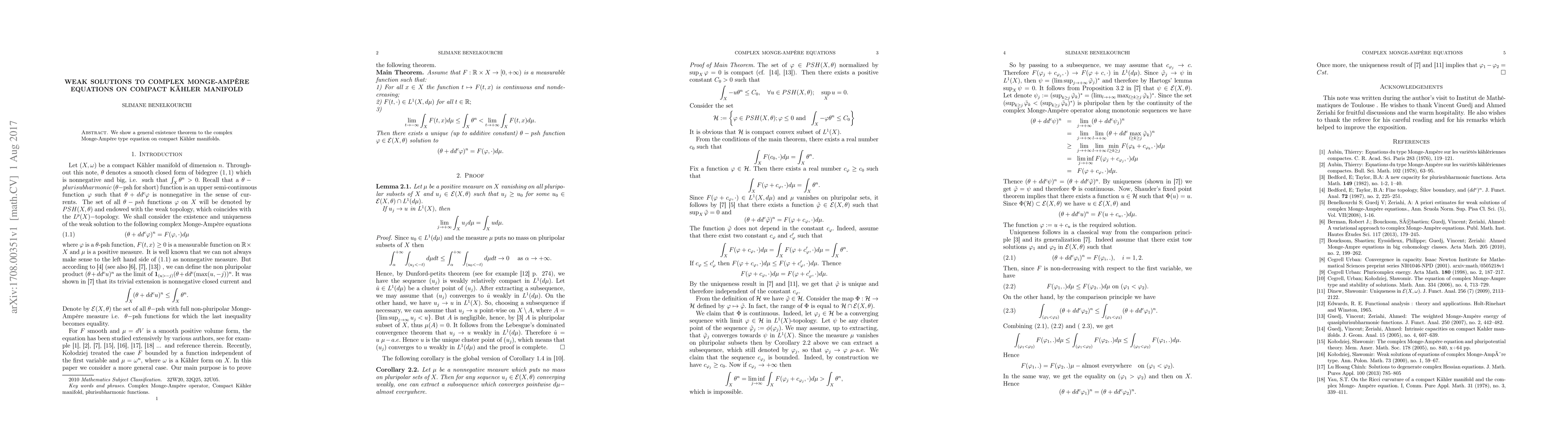 Summary: This paper establishes a general existence theorem for weak solutions to complex Monge-Ampère equations on compact Kähler manifolds. The results provide a significant advancement in understanding the behavior of such equations in complex geometry.
