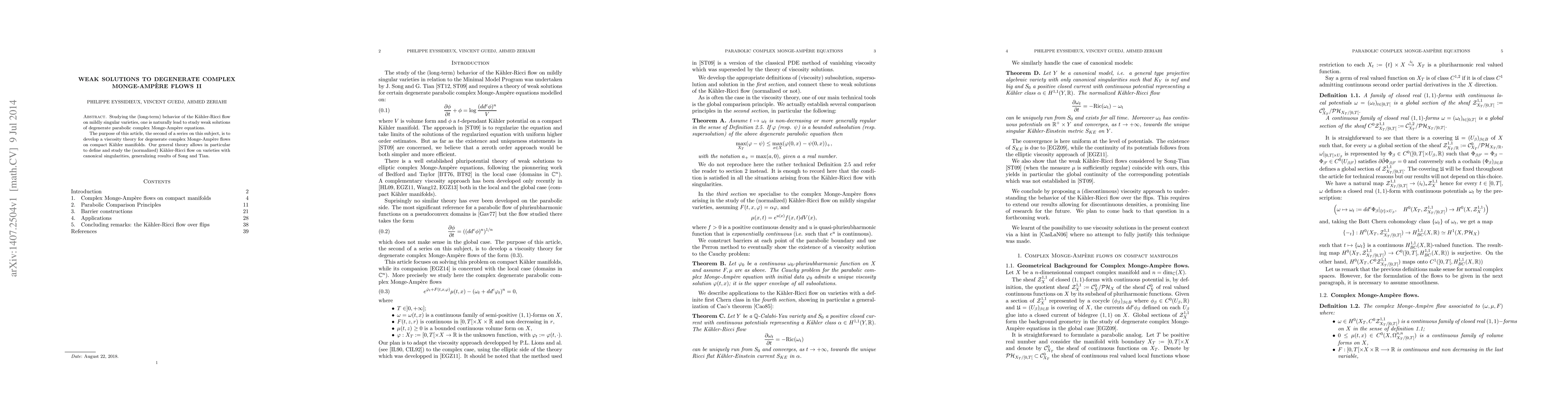 Studying the (long-term) behavior of the K\"ahler-Ricci flow on mildly singular varieties, one is naturally lead to study weak solutions of degenerate parabolic complex Monge-Amp\'ere equations. The purpose of this article, the second of a series on this subject, is to develop a viscosity theory for degenerate complex Monge-Amp\'ere flows on compact K\"ahler manifolds. Our general theory allows in particular to define and study the (normalized) K\"ahler-Ricci flow on varieties with canonical singularities, generalizing results of Song and Tian.