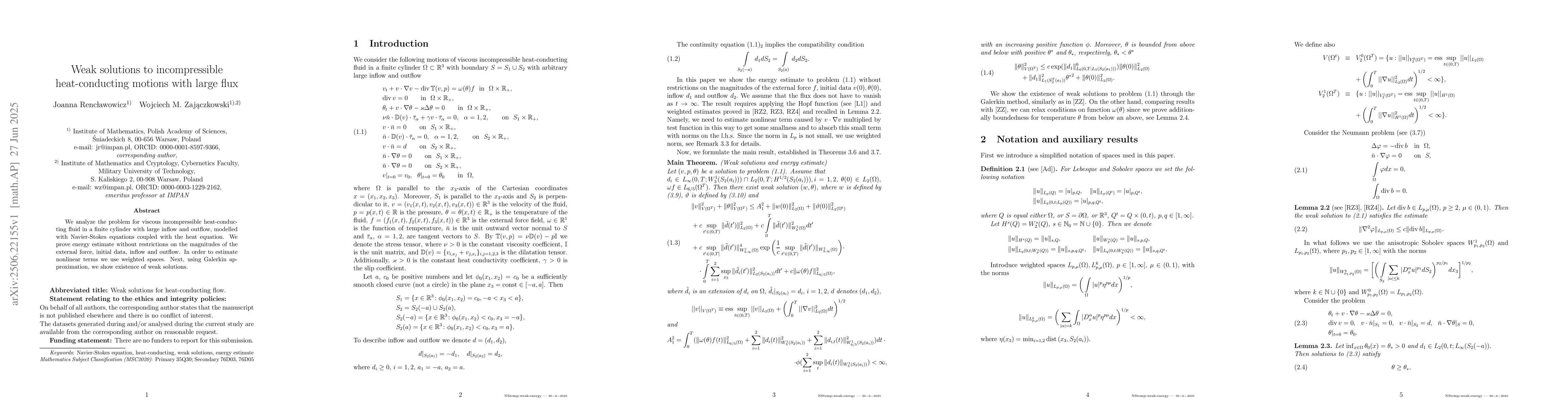 We analyze the problem for viscous incompressible heat-conduc\-ting fluid in a finite cylinder with large inflow and outflow, modelled with Navier-Stokes equations coupled with the heat equation. We prove energy estimate without restrictions on the magnitudes of the external force, initial data, inflow and outflow. In order to estimate nonlinear terms we use weighted spaces. Next, using Galerkin approximation, we show existence of weak solutions.
