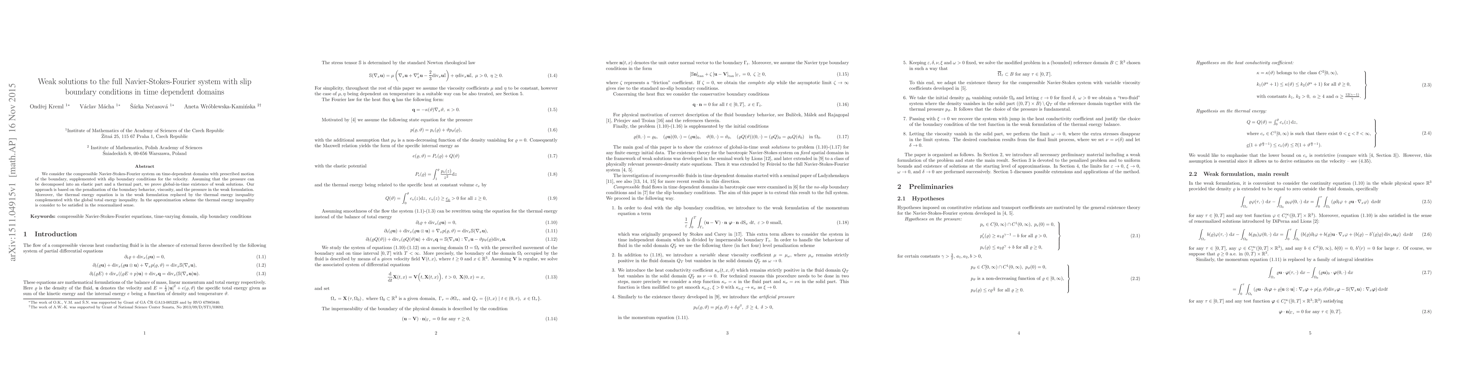 This paper proves the global-in-time existence of weak solutions for the compressible Navier-Stokes-Fourier system in time-dependent domains with slip boundary conditions. The authors achieve this through the penalization method applied to boundary behavior, viscosity, and pressure, and utilize a thermal energy inequality in the weak formulation.