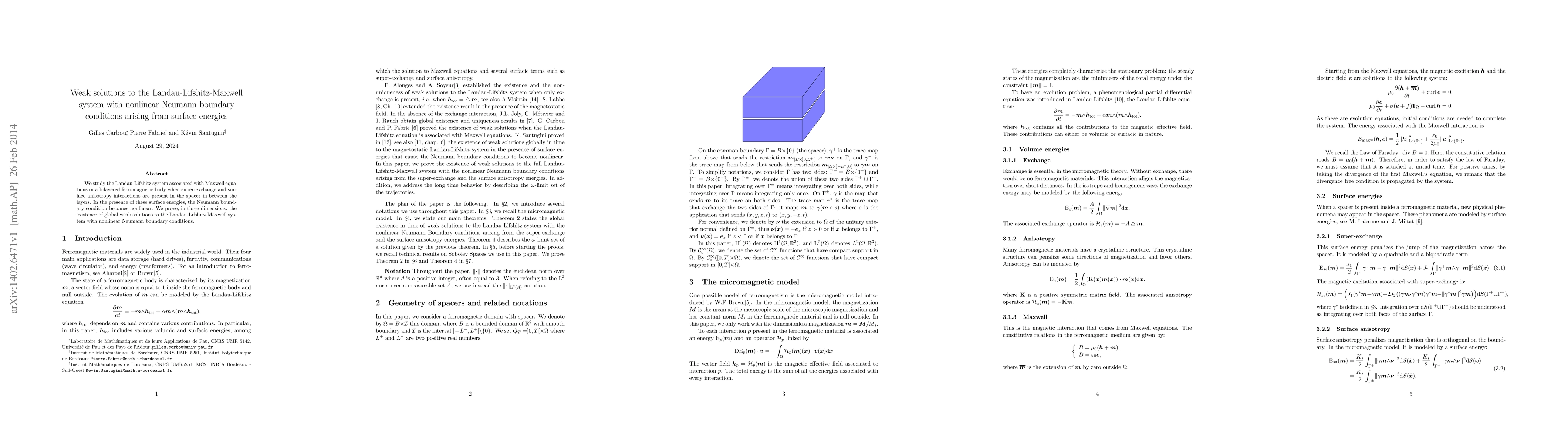 We study the Landau-Lifshitz system associated with Maxwell equations in a bilayered ferromagnetic body when super-exchange and surface anisotropy interactions are present in the spacer in-between the layers. In the presence of these surface energies, the Neumann boundary condition becomes nonlinear. We prove, in three dimensions, the existence of global weak solutions to the Landau-Lifshitz-Maxwell system with nonlinear Neumann boundary conditions.