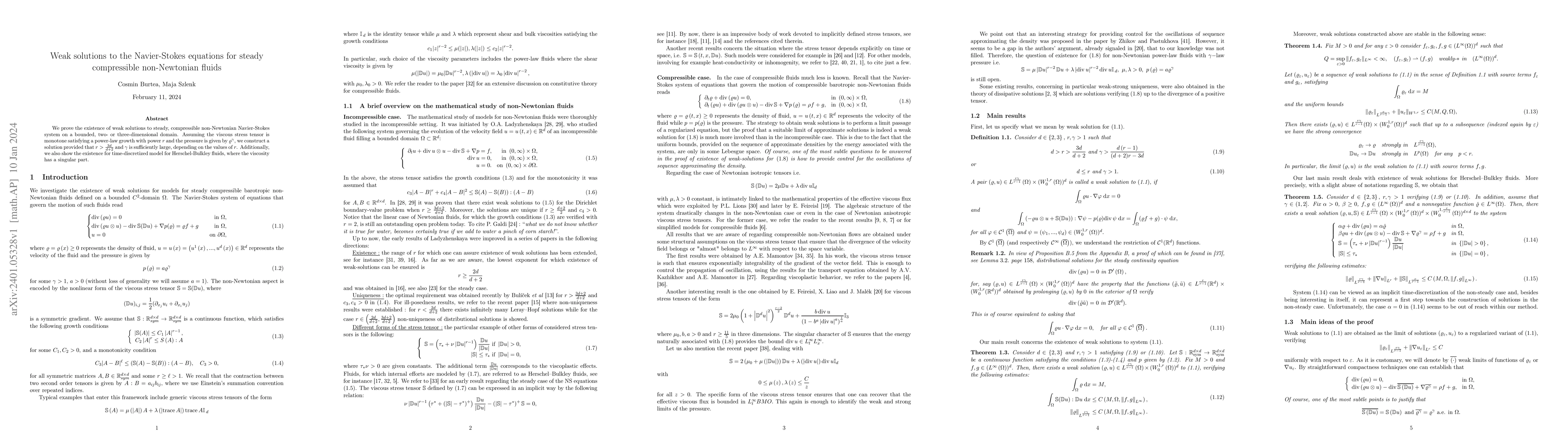 This paper proves the existence of weak solutions for steady, compressible non-Newtonian Navier-Stokes equations under specific conditions on the power-law growth of the viscous stress tensor and the pressure term. It also extends the results to a time-discretized model for Herschel-Bulkley fluids.