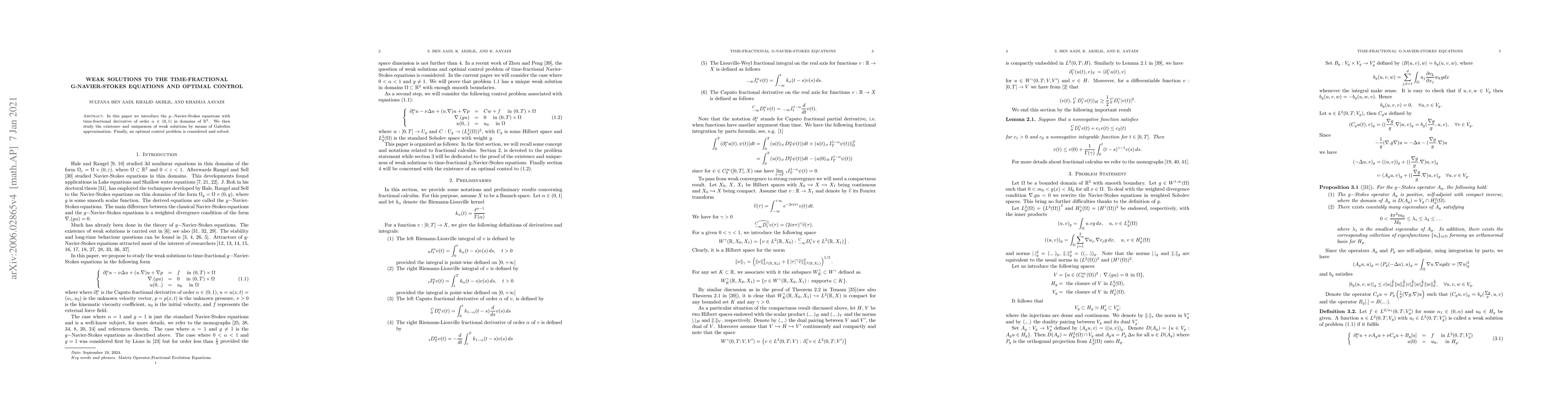 In this paper we introduce the $g-$Navier-Stokes equations with time-fractional derivative of order $\alpha\in(0,1)$ in domains of $\mathbb R^2$. We then study the existence and uniqueness of weak solutions by means of Galerkin approximation. Finally, an optimal control problem is considered and solved.