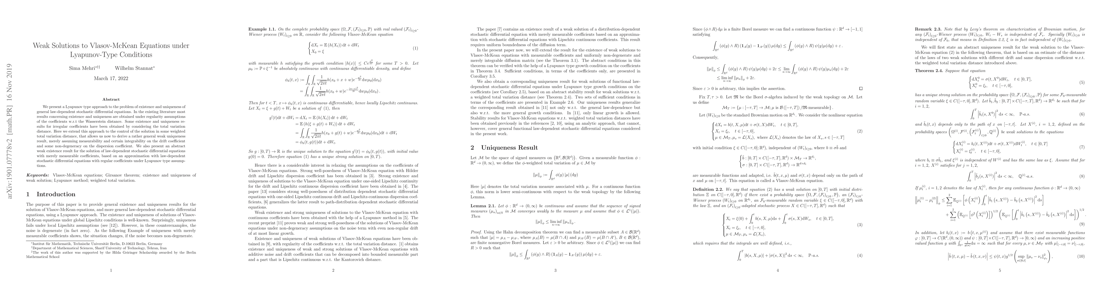 We present a Lyapunov type approach to the problem of existence and uniqueness of general law-dependent stochastic differential equations. In the existing literature most results concerning existence and uniqueness are obtained under regularity assumptions of the coefficients w.r.t the Wasserstein distance. Some existence and uniqueness results for irregular coefficients have been obtained by considering the total variation distance. Here we extend this approach to the control of the solution in some weighted total variation distance, that allows us now to derive a rather general weak uniqueness result, merely assuming measurability and certain integrability on the drift coefficient and some non-degeneracy on the dispersion coefficient. We also present an abstract weak existence result for the solution of law-dependent stochastic differential equations with merely measurable coefficients, based on an approximation with law-dependent stochastic differential equations with regular coefficients under Lyapunov type assumptions.