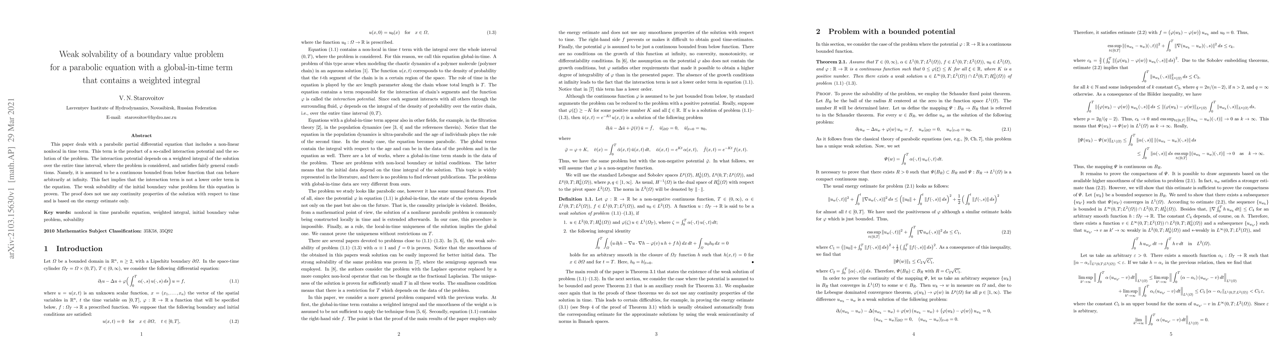 This paper deals with a parabolic partial differential equation that includes a non-linear nonlocal in time term. This term is the product of a so-called interaction potential and the solution of the problem. The interaction potential depends on a weighted integral of the solution over the entire time interval, where the problem is considered, and satisfies fairly general conditions. Namely, it is assumed to be a continuous bounded from below function that can behave arbitrarily at infinity. This fact implies that the interaction term is not a lower order term in the equation. The weak solvability of the initial boundary value problem for this equation is proven. The proof does not use any continuity properties of the solution with respect to time and is based on the energy estimate only.