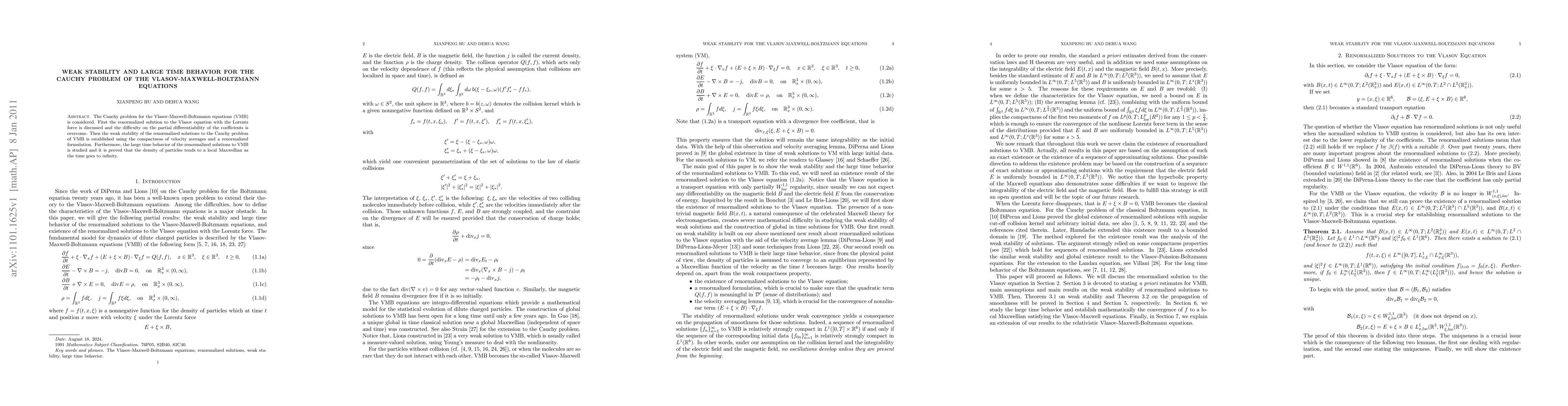 The Cauchy problem for the Vlasov-Maxwell-Boltzmann equations (VMB) is considered. First the renormalized solution to the Vlasov equation with the Lorentz force is discussed and the difficulty on the partial differentiability of the coefficients is overcome. Then the weak stability of the renormalized solutions to the Cauchy problem of VMB is established using the compactness of velocity averages and a renormalized formulation. Furthermore, the large time behavior of the renormalized solutions to VMB is studied and it is proved that the density of particles tends to a local Maxwellian as the time goes to infinity.