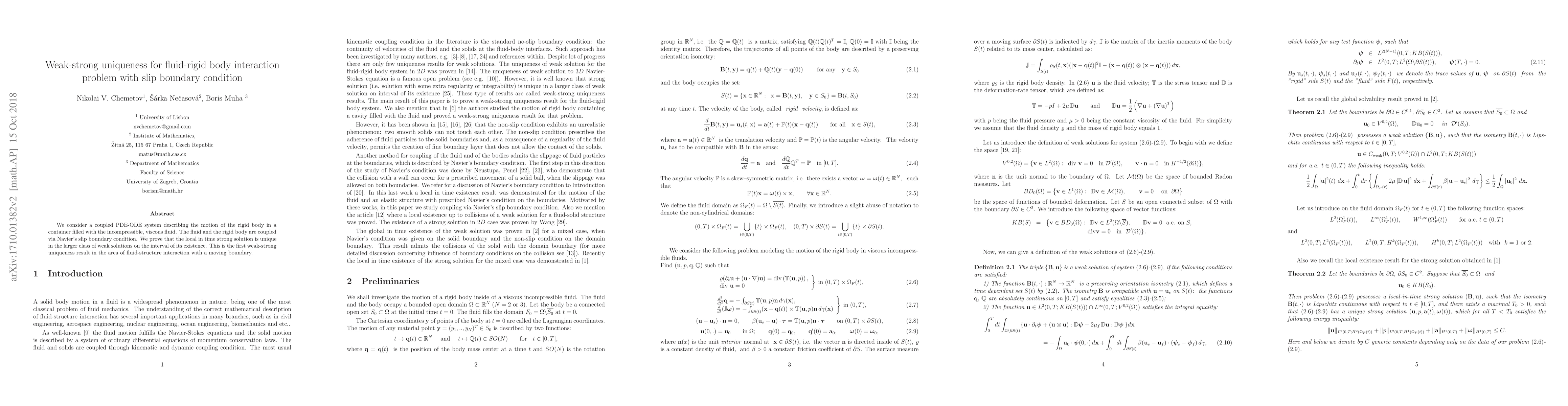 This paper proves the weak-strong uniqueness for a fluid-rigid body interaction problem governed by a coupled PDE-ODE system and a Navier slip boundary condition. It establishes that the strong solution is unique among weak solutions within the interval of its existence, marking the first such result for fluid-structure interaction with a moving boundary.