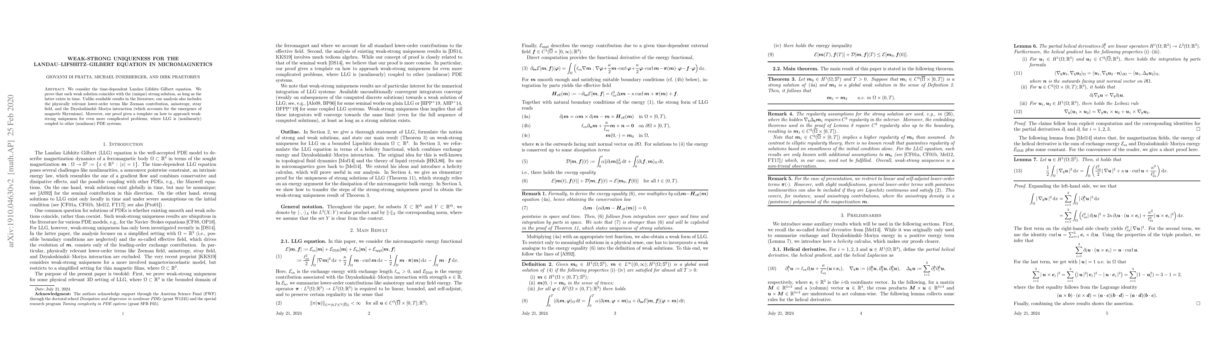 This paper proves the weak-strong uniqueness for the Landau-Lifshitz-Gilbert equation in micromagnetics, showing that weak solutions coincide with strong solutions where the latter exists. The analysis includes physically relevant lower-order terms and provides a template for tackling similar problems involving coupled nonlinear PDE systems.