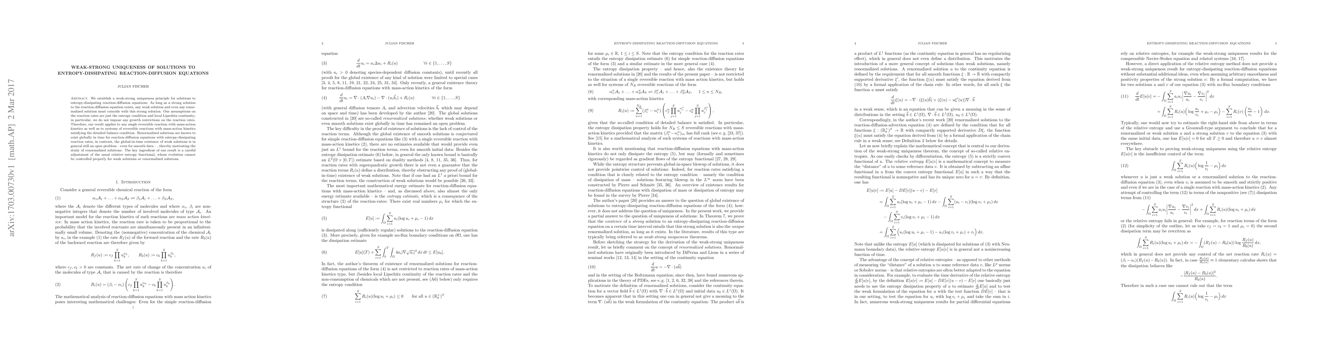We establish a weak-strong uniqueness principle for solutions to entropy-dissipating reaction-diffusion equations: As long as a strong solution to the reaction-diffusion equation exists, any weak solution and even any renormalized solution must coincide with this strong solution. Our assumptions on the reaction rates are just the entropy condition and local Lipschitz continuity; in particular, we do not impose any growth restrictions on the reaction rates. Therefore, our result applies to any single reversible reaction with mass-action kinetics as well as to systems of reversible reactions with mass-action kinetics satisfying the detailed balance condition. Renormalized solutions are known to exist globally in time for reaction-diffusion equations with entropy-dissipating reaction rates; in contrast, the global-in-time existence of weak solutions is in general still an open problem - even for smooth data - , thereby motivating the study of renormalized solutions. The key ingredient of our result is a careful adjustment of the usual relative entropy functional, whose evolution cannot be controlled properly for weak solutions or renormalized solutions.