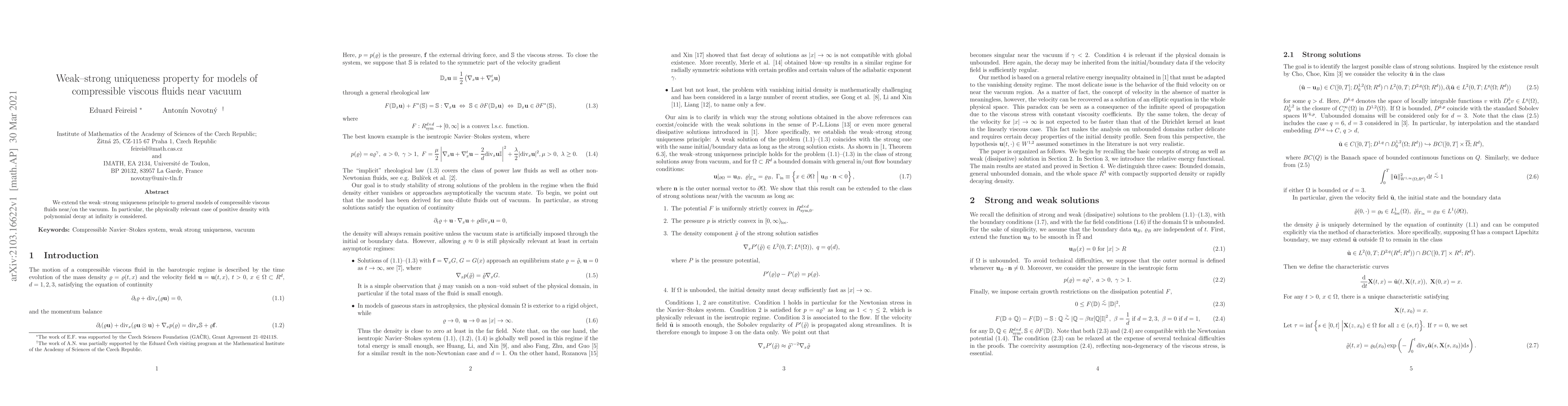 Summary: This paper extends the weak-strong uniqueness principle to compressible viscous fluid models near vacuum, focusing on scenarios with positive density that decays polynomially at infinity. The results provide insights into the behavior of such fluids in vacuum conditions.