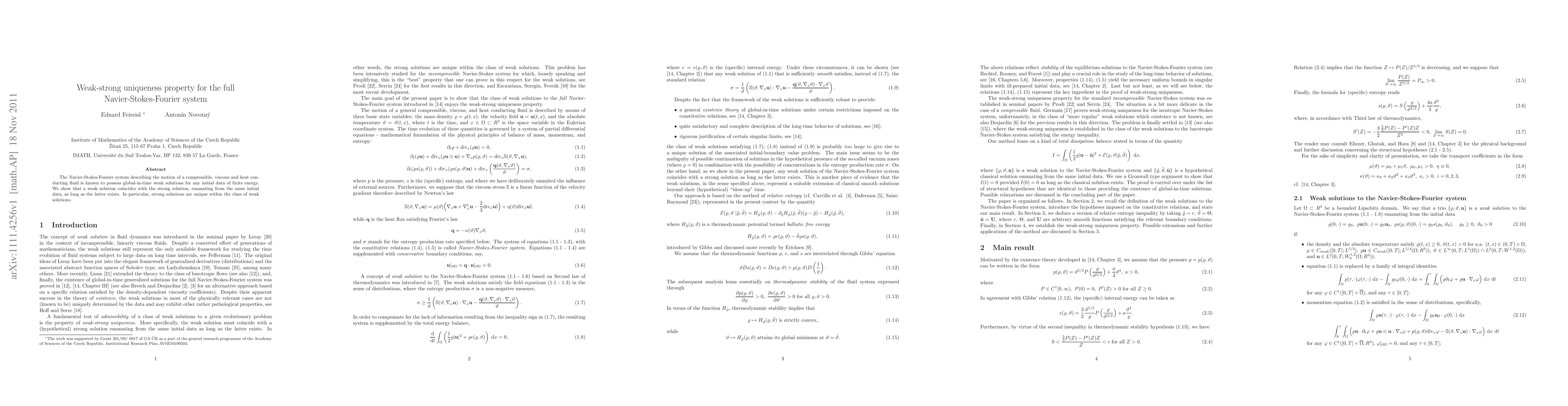 The Navier-Stokes-Fourier system has a unique strong solution for each initial data set that also has a corresponding weak solution, ensuring uniqueness within the class of solutions. This finding provides insight into the behavior of compressible fluids under certain conditions.
