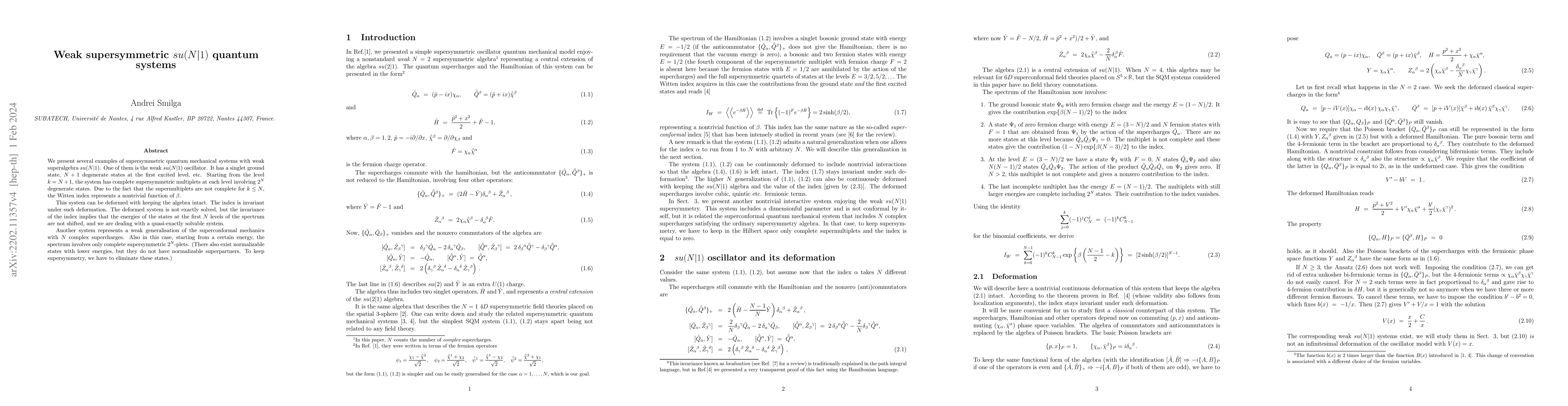 We present several examples of supersymmetric quantum mechanical systems with weak superalgebra $su(N|1)$. One of them is the weak $su(N|1)$ oscillator. It has a singlet ground state, $N +1$ degenerate states at the first excited level, etc. Starting from the level $k = N+1$, the system has complete supersymmetric multiplets at each level involving $2^N$ degenerate states. Due to the fact that the supermultiplets are not complete for $k \leq N$, the Witten index represents a nontrivial function of $\beta$. This system can be deformed with keeping the algebra intact. The index is invariant under such deformation. The deformed system is not exactly solved, but the invariance of the index implies that the energies of the states at the first $N$ levels of the spectrum are not shifted, and we are dealing with a quasi-exactly solvable system. Another system represents a weak generalisation of the superconformal mechanics with $N$ complex supercharges. Also in this case, starting from a certain energy, the spectrum involves only complete supersymmetric $2^N$-plets. (There also exist normalizable states with lower energies, but they do not have normalizable superpartners. To keep supersymmetry, we have to eliminate these states.)