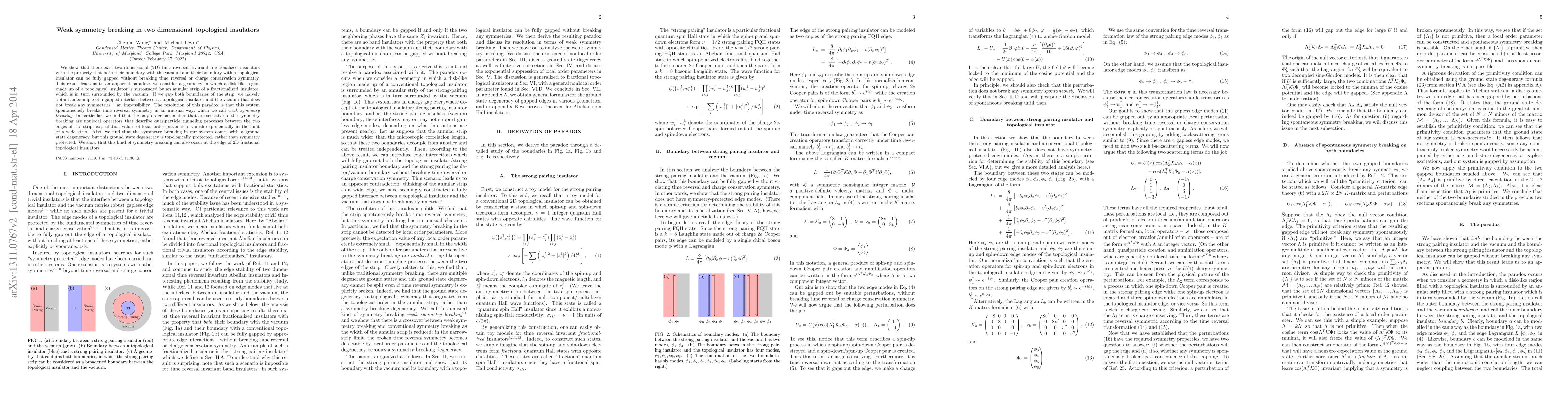 This paper reveals a paradox in 2D topological insulators where gapping boundaries without symmetry breaking seems impossible. The resolution involves "weak symmetry breaking," where nonlocal order parameters indicate spontaneous symmetry breaking, while local ones vanish, preserving topological protection of ground state degeneracy.